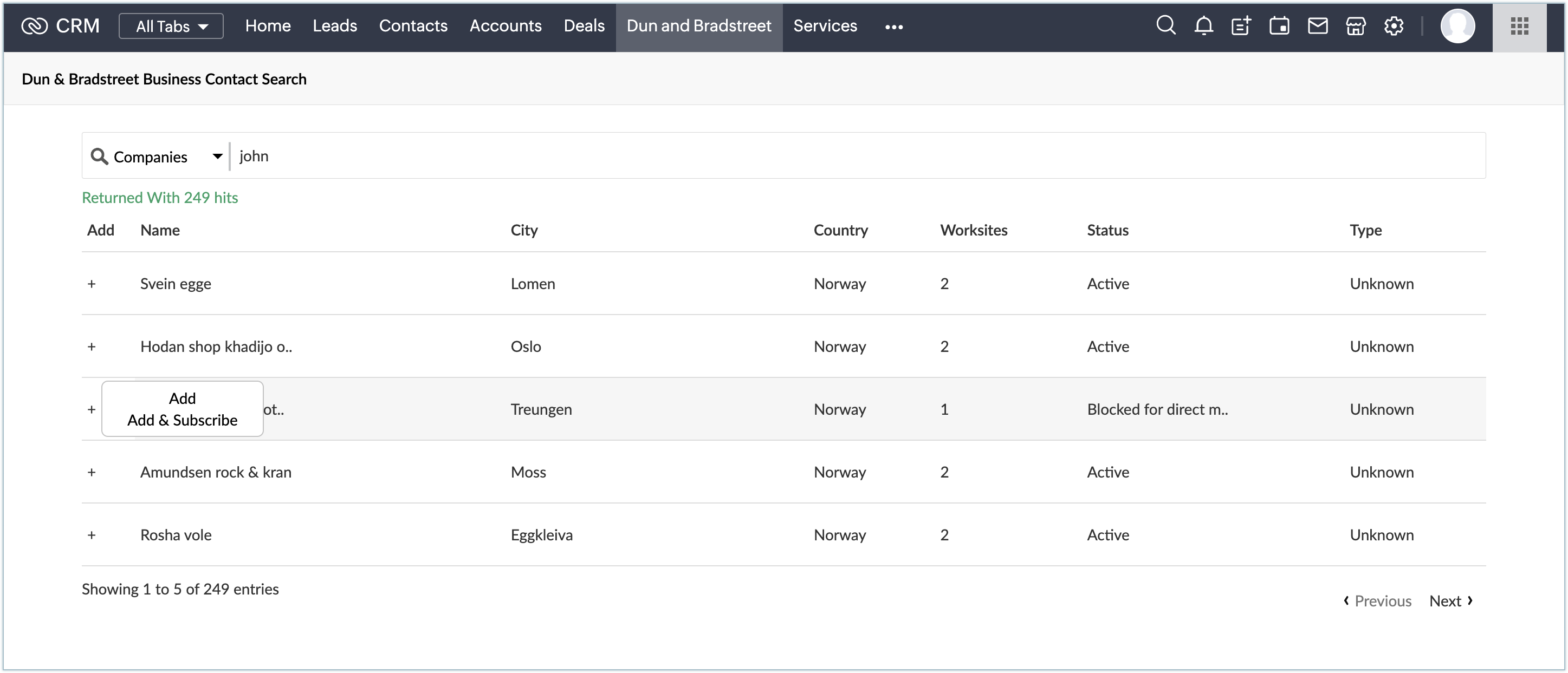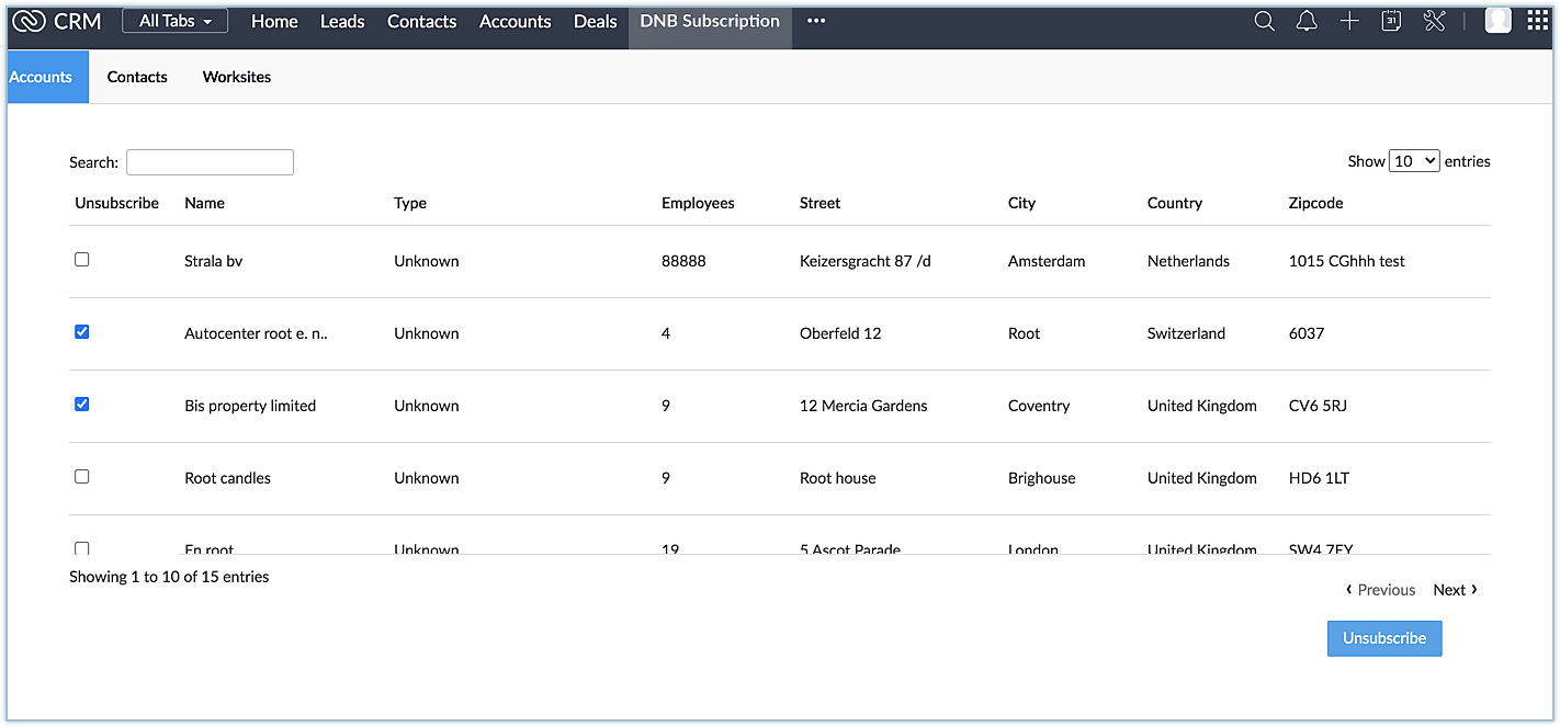 2. Add & Subscribe - The selected entries along with the subscribed fields will be added to either the contacts or accounts module in Zoho CRM, and will also be listed under the DNB Subscription web tab.