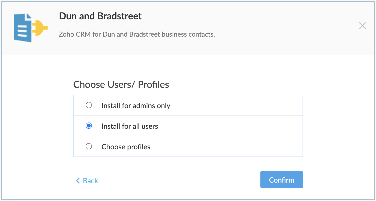 3. Choose profiles - The extension will be installed in CRM for manually chosen users. Choose this option, click Confirm, then select the desired profiles.