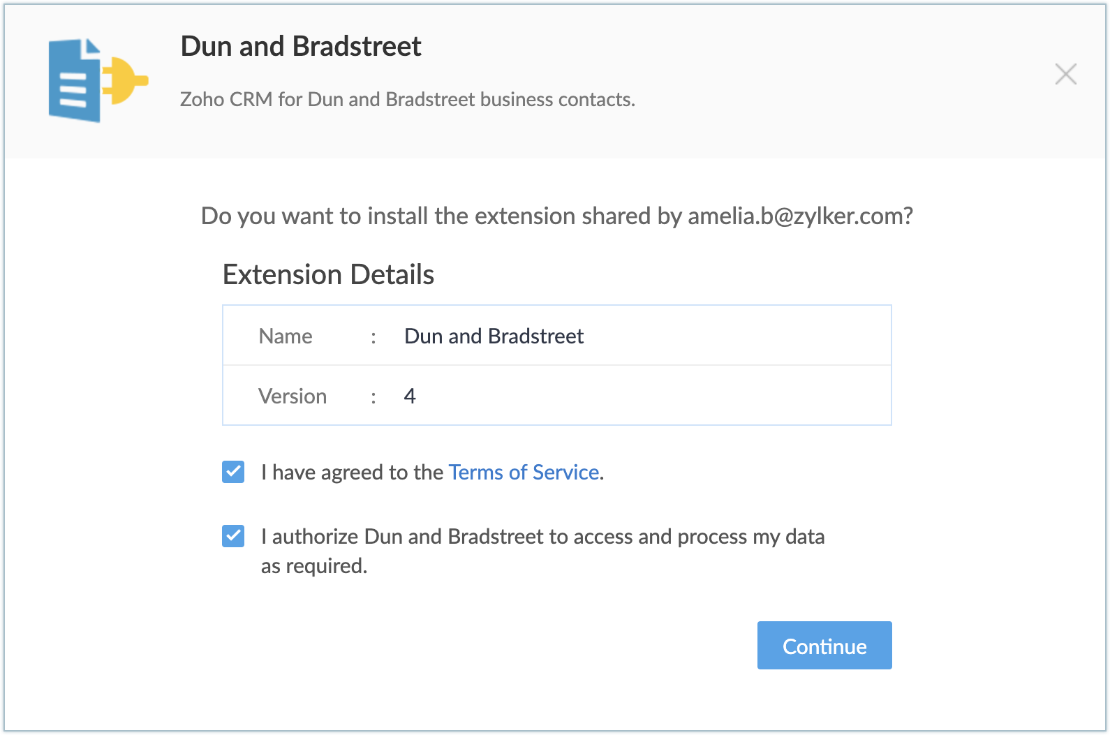 Note: If you skip this step, you can authorize it later from your Setup page in Zoho CRM. To do so, go to Setup > Marketplace > All. Find the Dun and Bradstreet extension and click Configure.