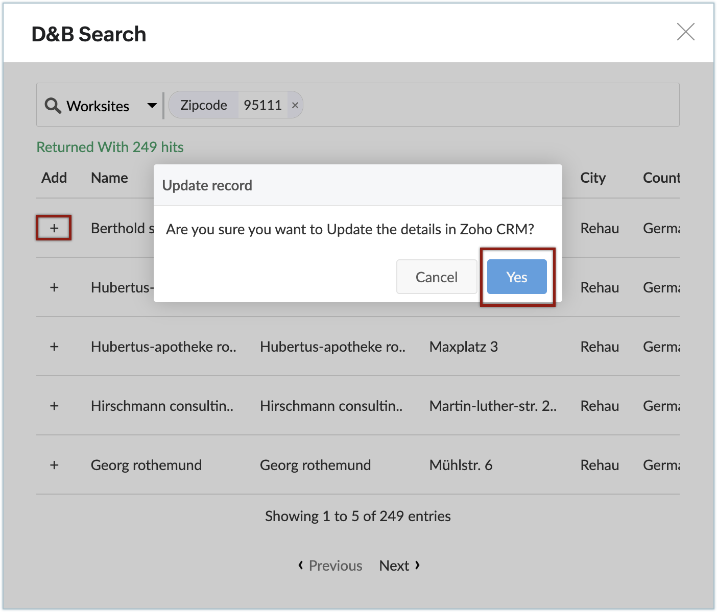 A list of matching entries available in Dun & Bradstreet will appear.