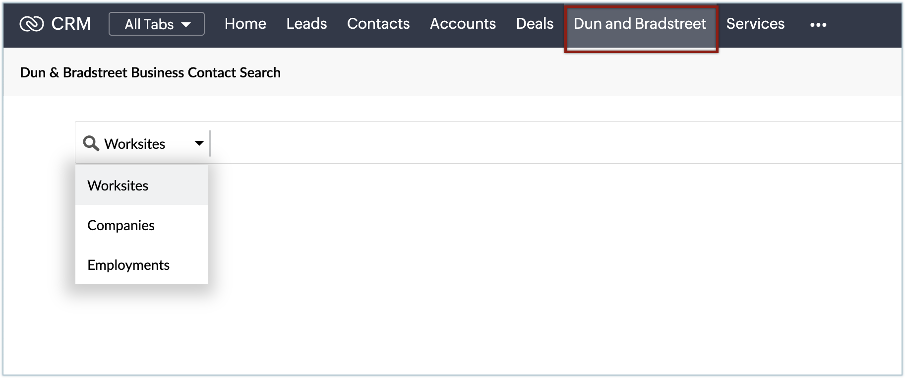 In Dun & Bradstreet, the contacts are stored under three categories: companies, worksites, and employment. You can search for a contact in Dun and Bradstreet from the Zoho CRM after selecting any of these three categories.