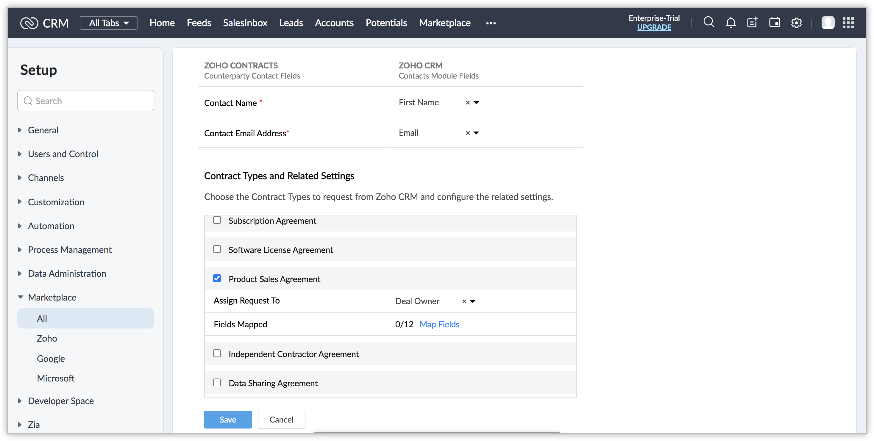 - Under Counterparty Contact Fields Mapping, select Zoho CRM fields from the drop-down. Based on this mapping, the primary contact details will get auto-populated in Zoho Contracts during contract requests.