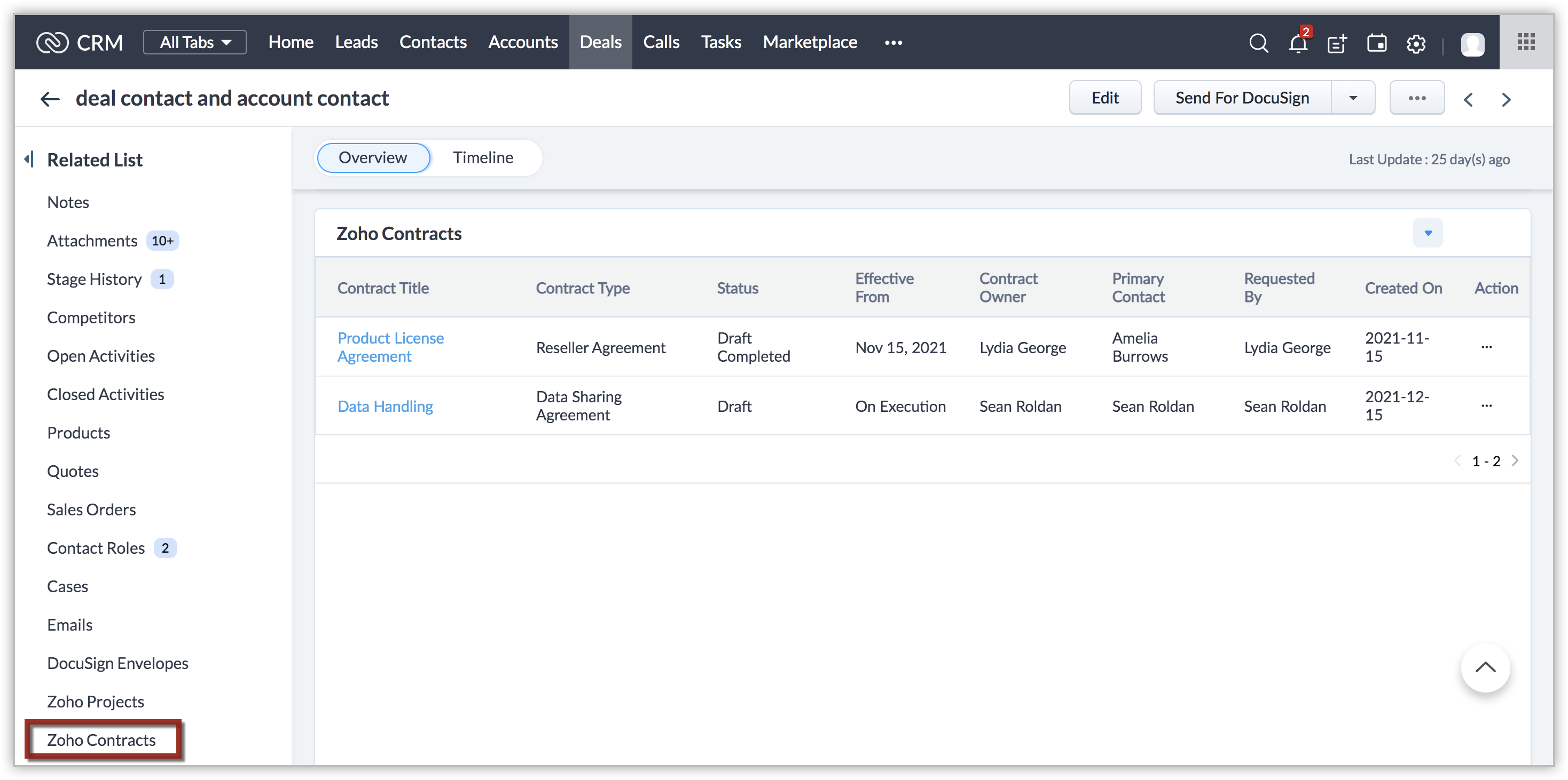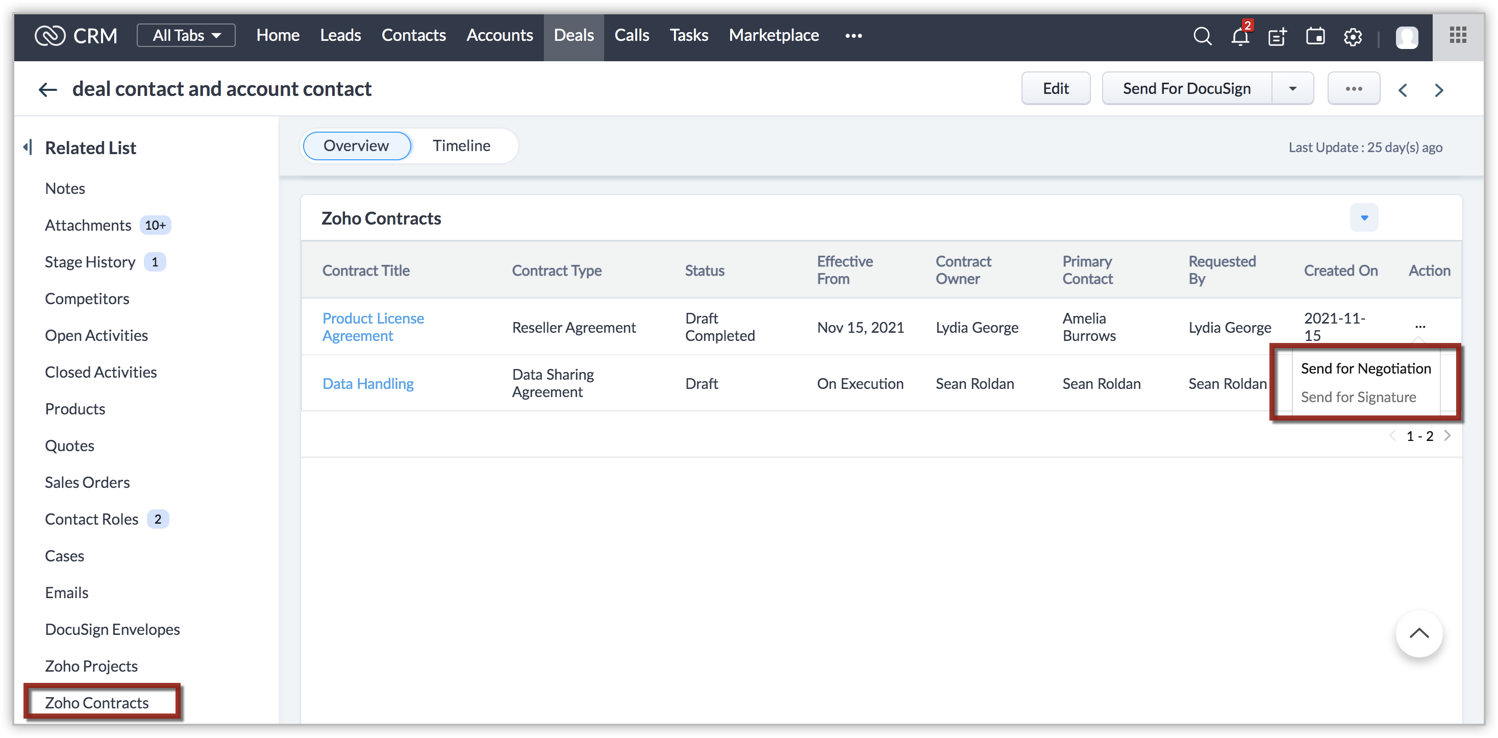 Note: In the Zoho Contracts related list of the Deals and Accounts module, the Contract Name will be hyperlinked for Account Owner, Admins, and the Contract owners. For others, the Contract Name will be displayed as normal text.