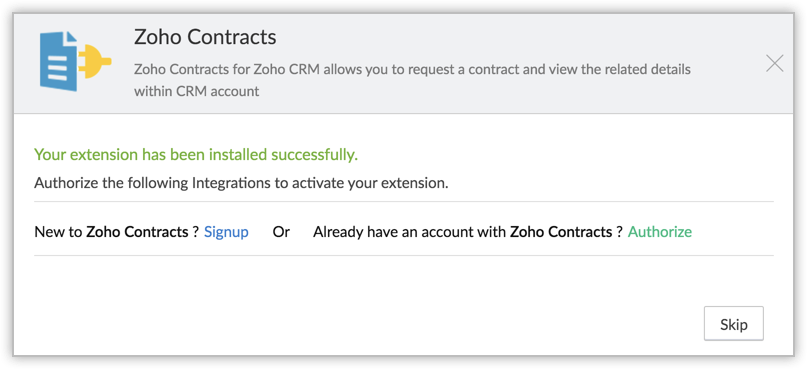 Once the extension is installed, you need to configure the extension in the Zoho Contracts - Settings page. Only then, the extension will be activated.