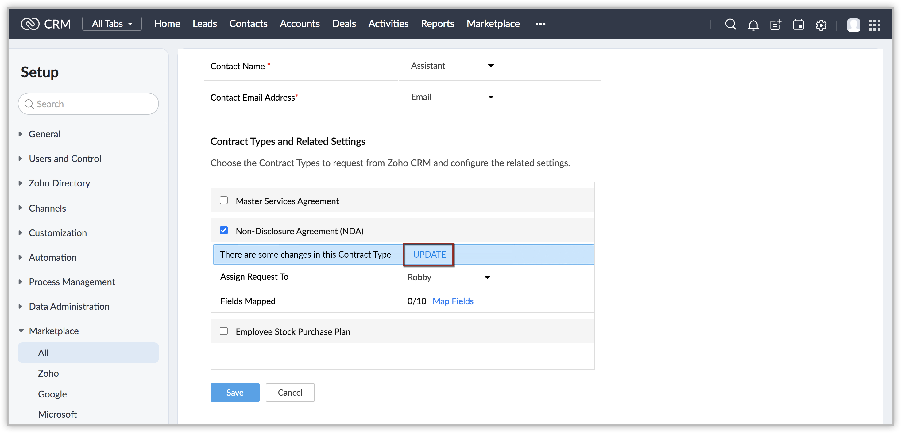 - If you make any changes to a Contract Type in Zoho Contracts, click Update adjacent to the respective contract type in the settings page in Zoho CRM.