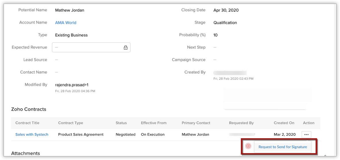 Once the extension is installed, a Request Contract button will be displayed on the record's details page of deals in Zoho CRM. Please note that you can request contracts only in the Deals module of Zoho CRM. While requesting contracts, both the direct contact associated with the deal and the contacts associated that particular deal account will be added as counterparty in Zoho Contracts.