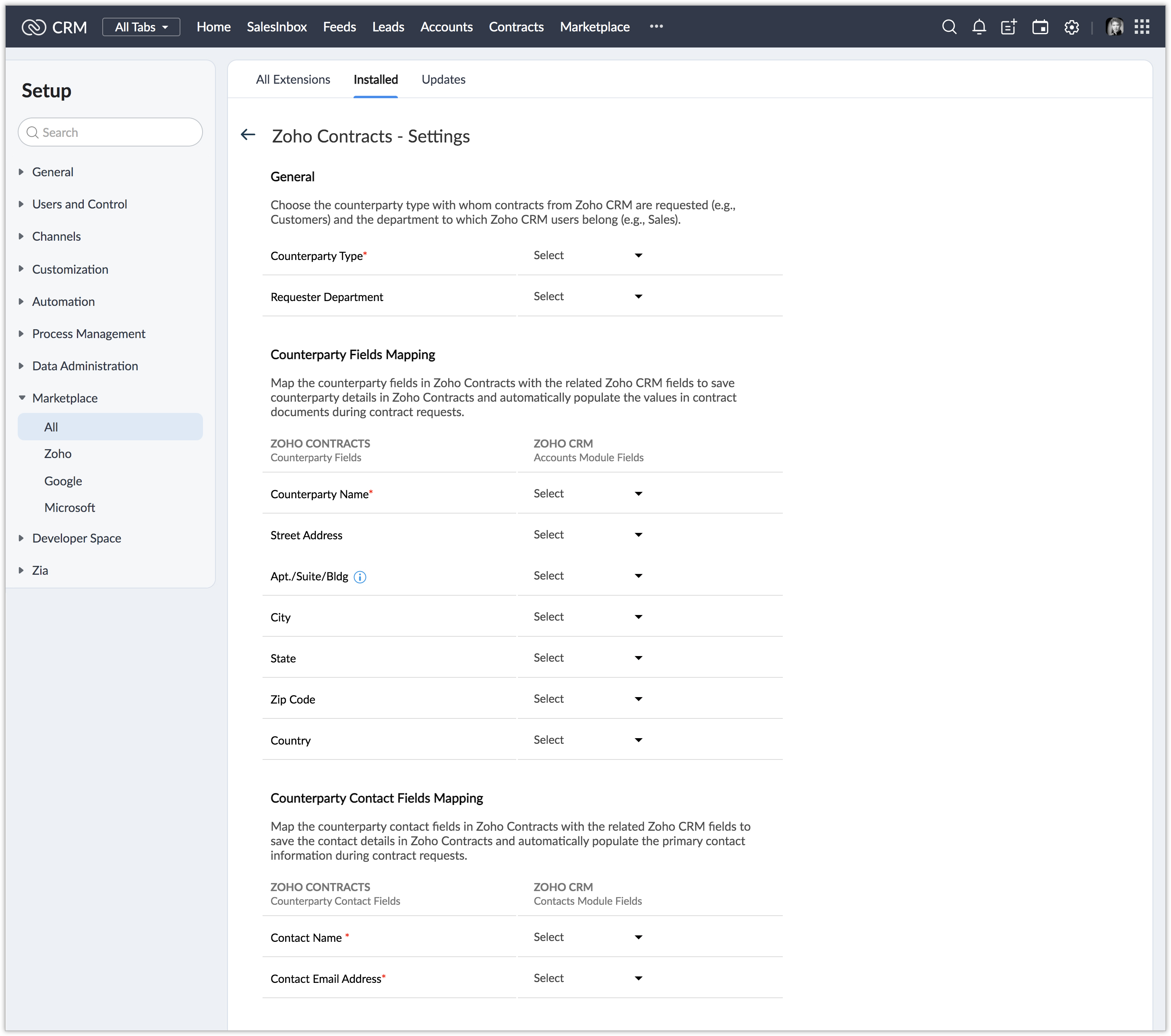- Under Counterparty Fields Mapping, select Zoho CRM fields from the drop-down. Based on the field mapping that you configure, the values in Zoho CRM fields will be populated automatically in Zoho Contracts during contract requests.