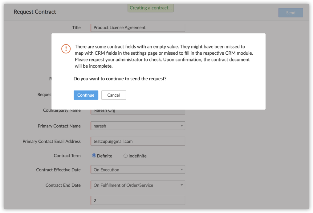 - A pop-up will be shown if there are unmapped fields available in the contract. Click Continue if you wish to proceed.