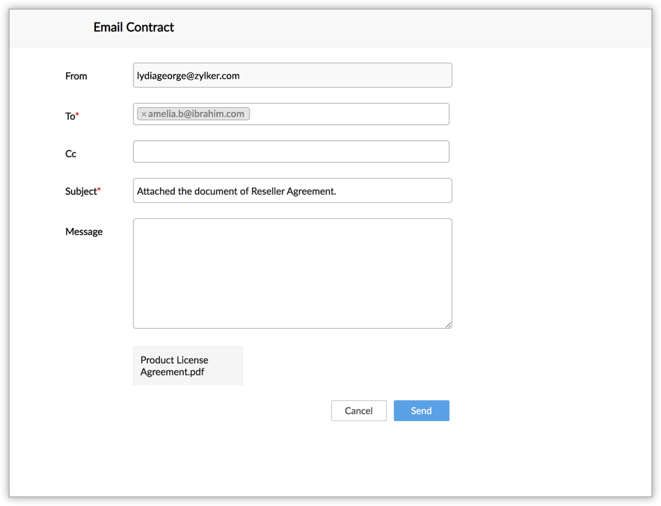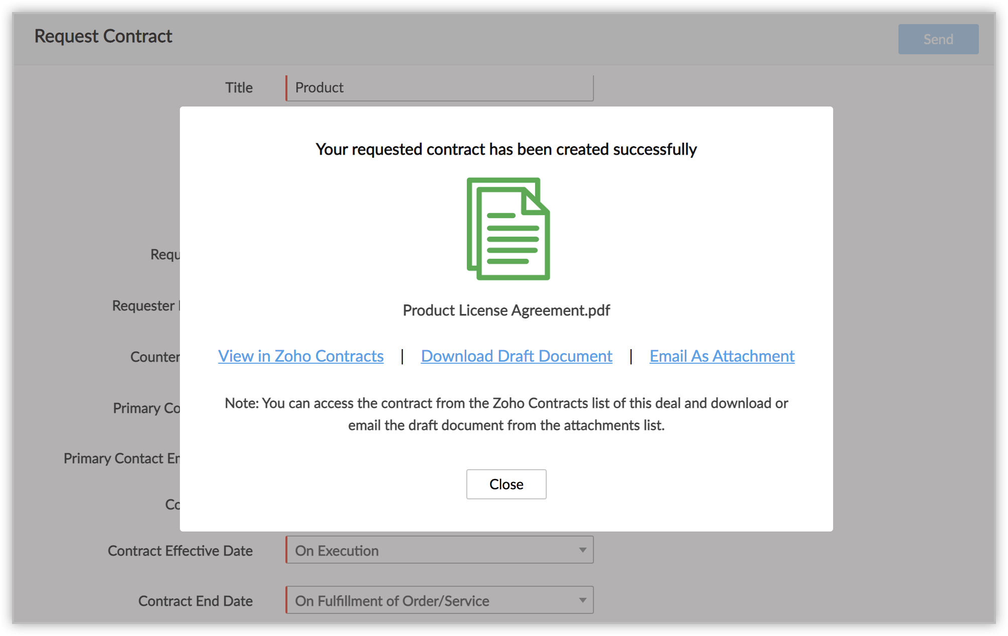 - Once the contract is created, you will get the options either to view it in Zoho Contracts, or download the draft contract or send it over email as an attachment.