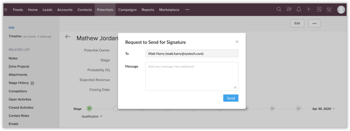 - Click View in Zoho Contracts to get redirected to the contract in Zoho Contracts.