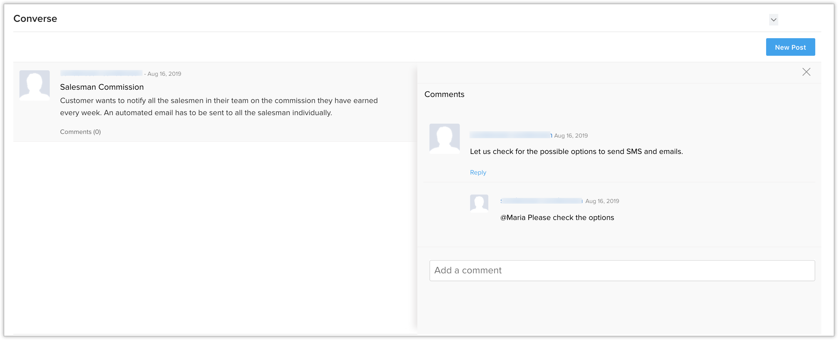 A conversation can be built by creating posts, and commenting on the posts. Also, one can even reply to those comments. The members can tag other members of the organization directly by mentioning them in the comments. For this, add @ followed by the member name. For ex:  @Tom Garry.