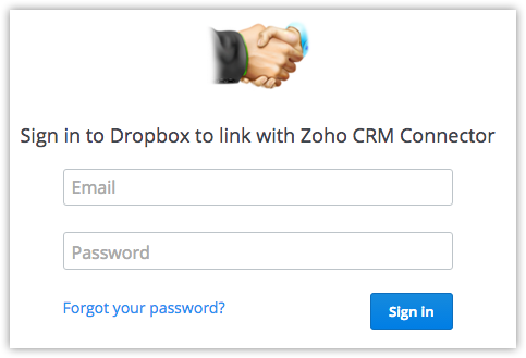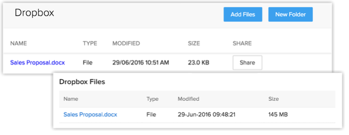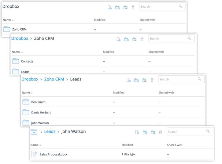 You can view and share files in Dropbox from Zoho CRM. With the Dropbox extension you can also upload files into Dropbox directly from Zoho CRM.
