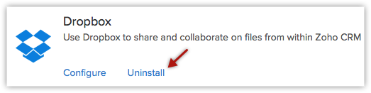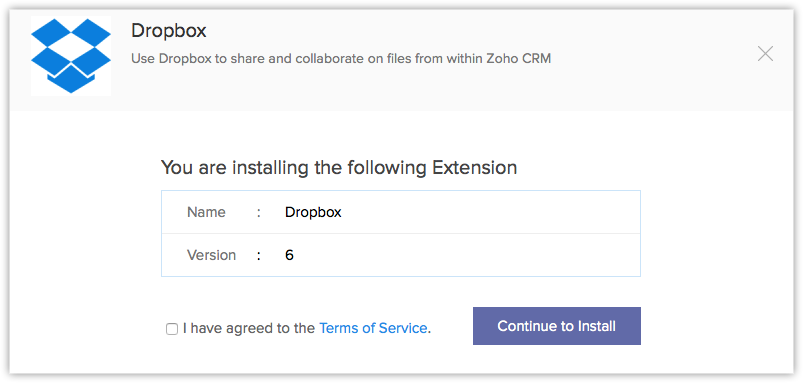 You can either go to the Zoho Marketplace and install the Dropbox extension or log in to your Zoho CRM account and install.