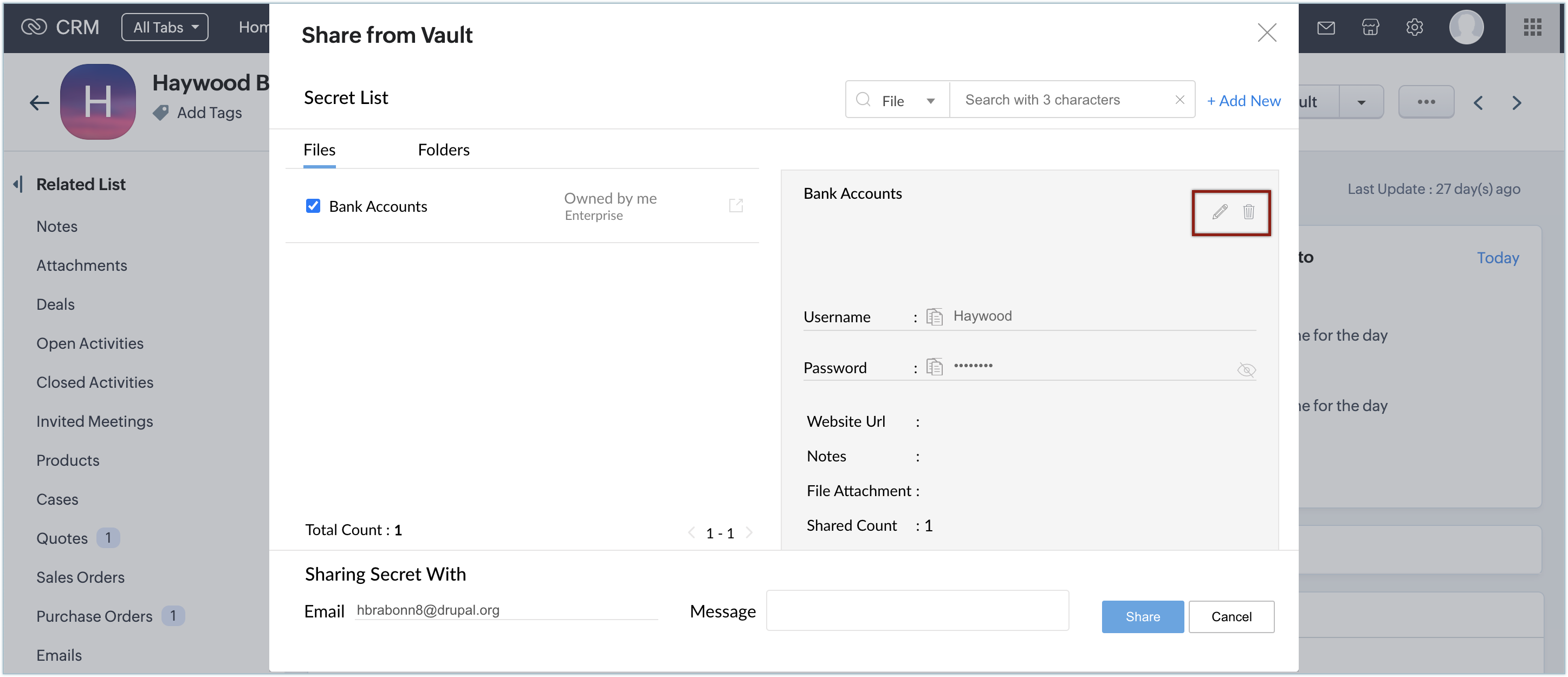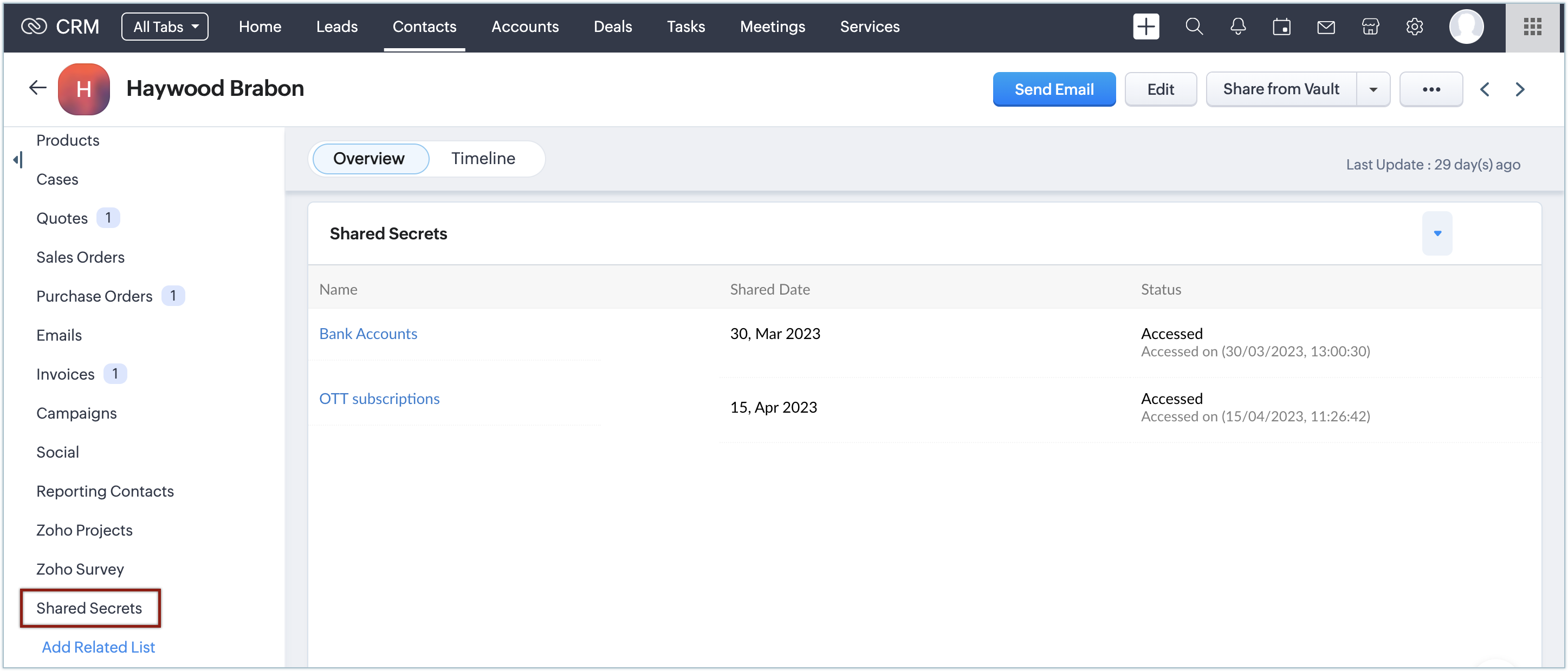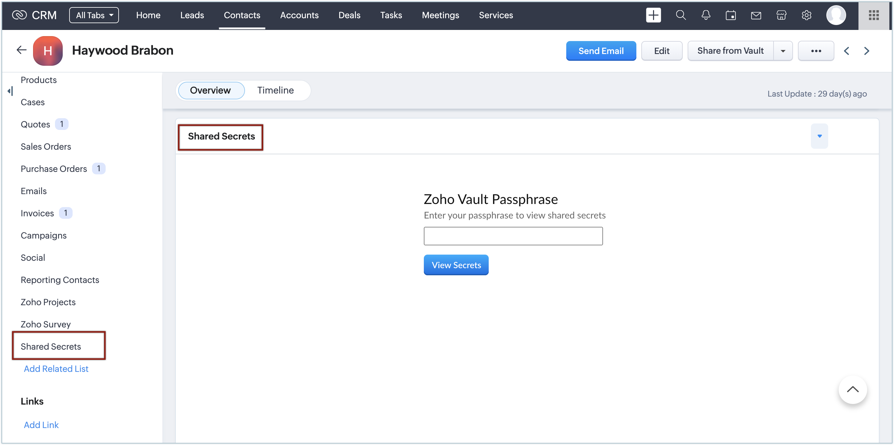 All the secrets that you share with every lead, contact, and account in Zoho CRM will be listed in the related list of that particular records.