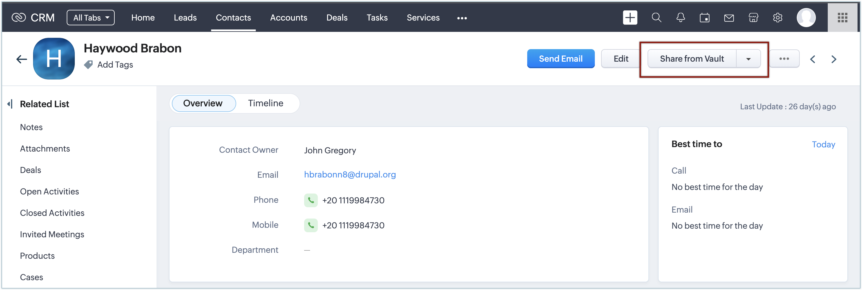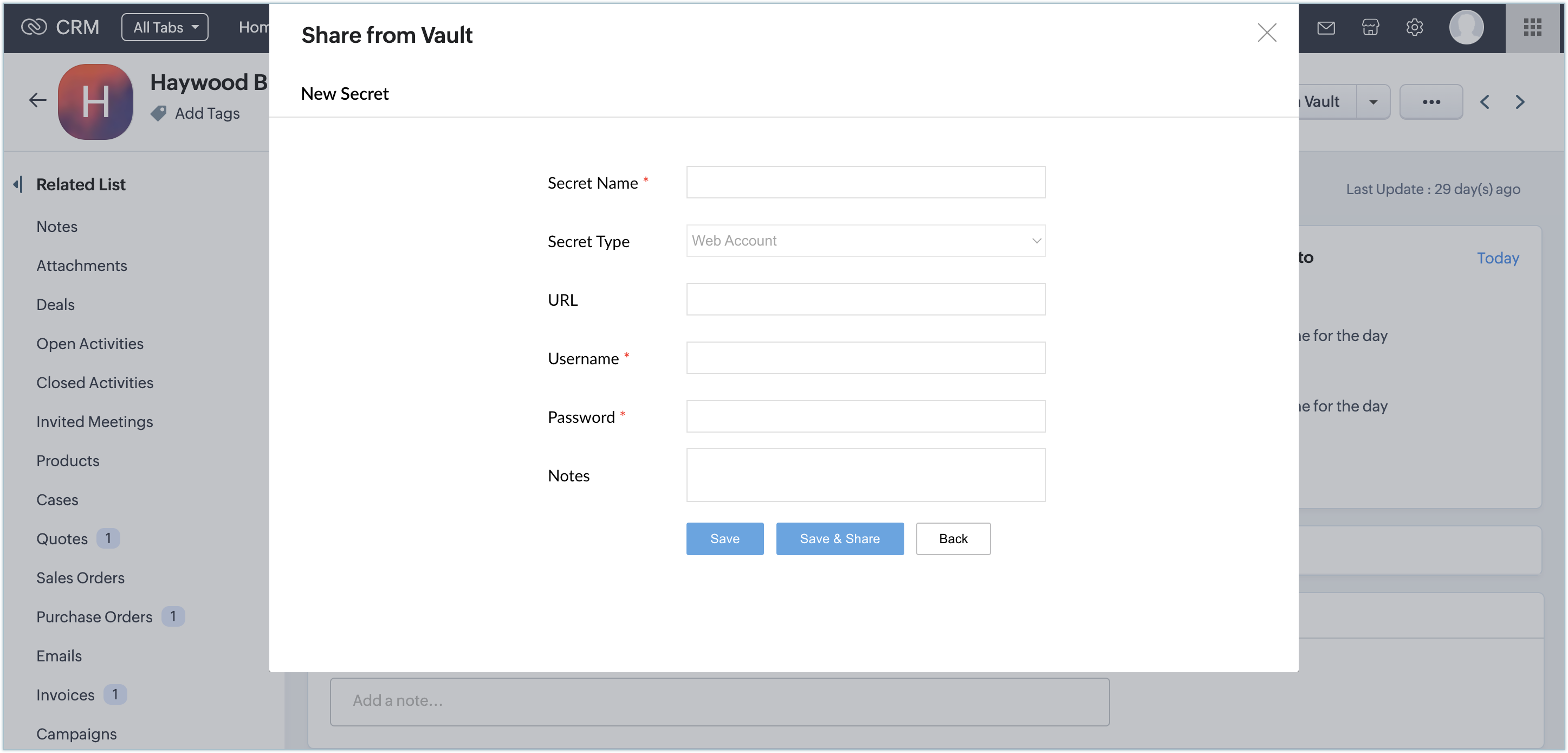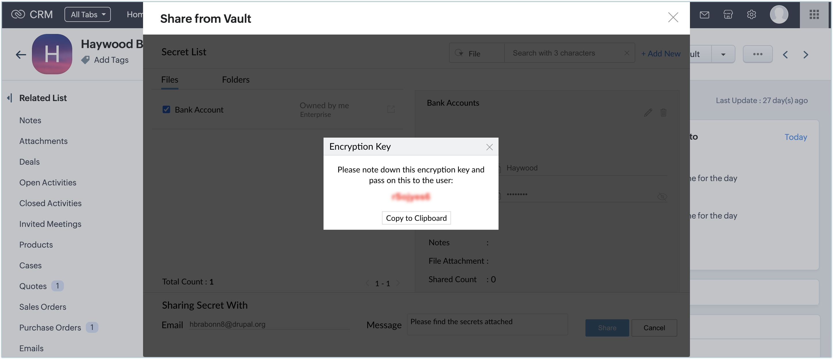 All the secrets that you share with every lead, contact, and account in Zoho CRM will be listed in the related list of that particular records.