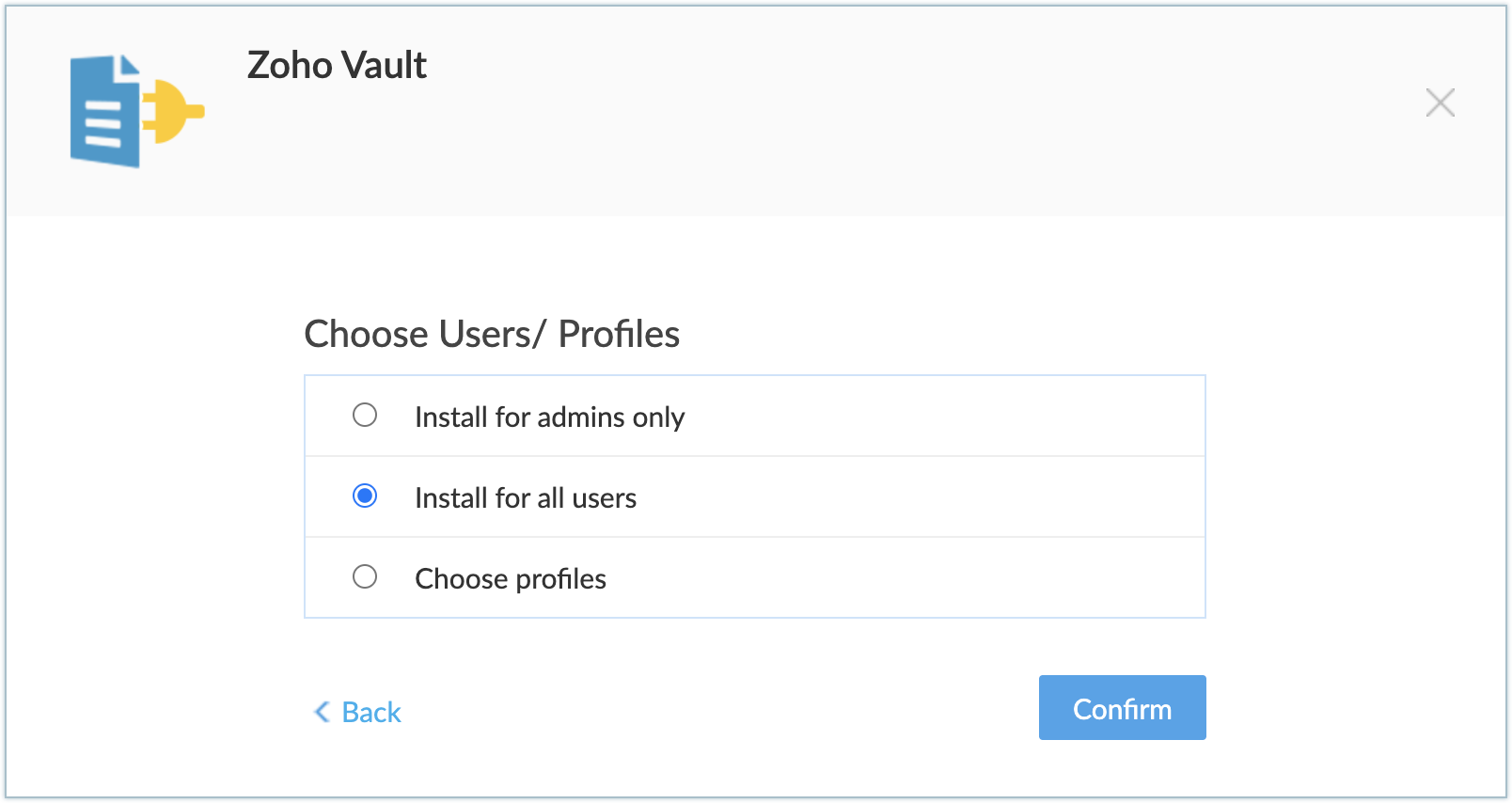 Choose profiles - The extension will be installed in CRM for manually chosen users. Choose this option, click Confirm, then select the desired profiles.
