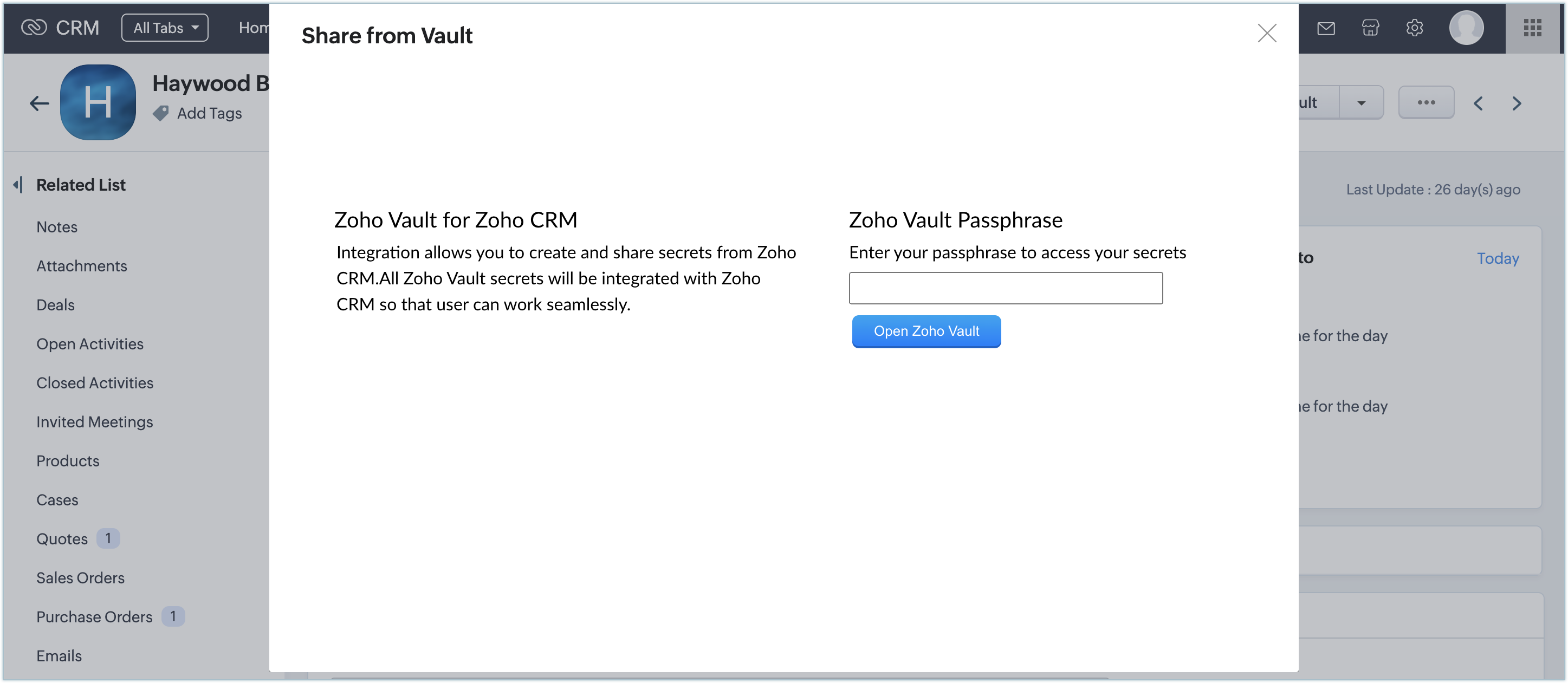 The Zoho Vault extension for Zoho CRM allows you to share passwords with your contacts and other third parties, with different levels of access permissions. All you need to do is just enter your Zoho Vault passphrase to access your passwords and other confidential data from Zoho CRM.