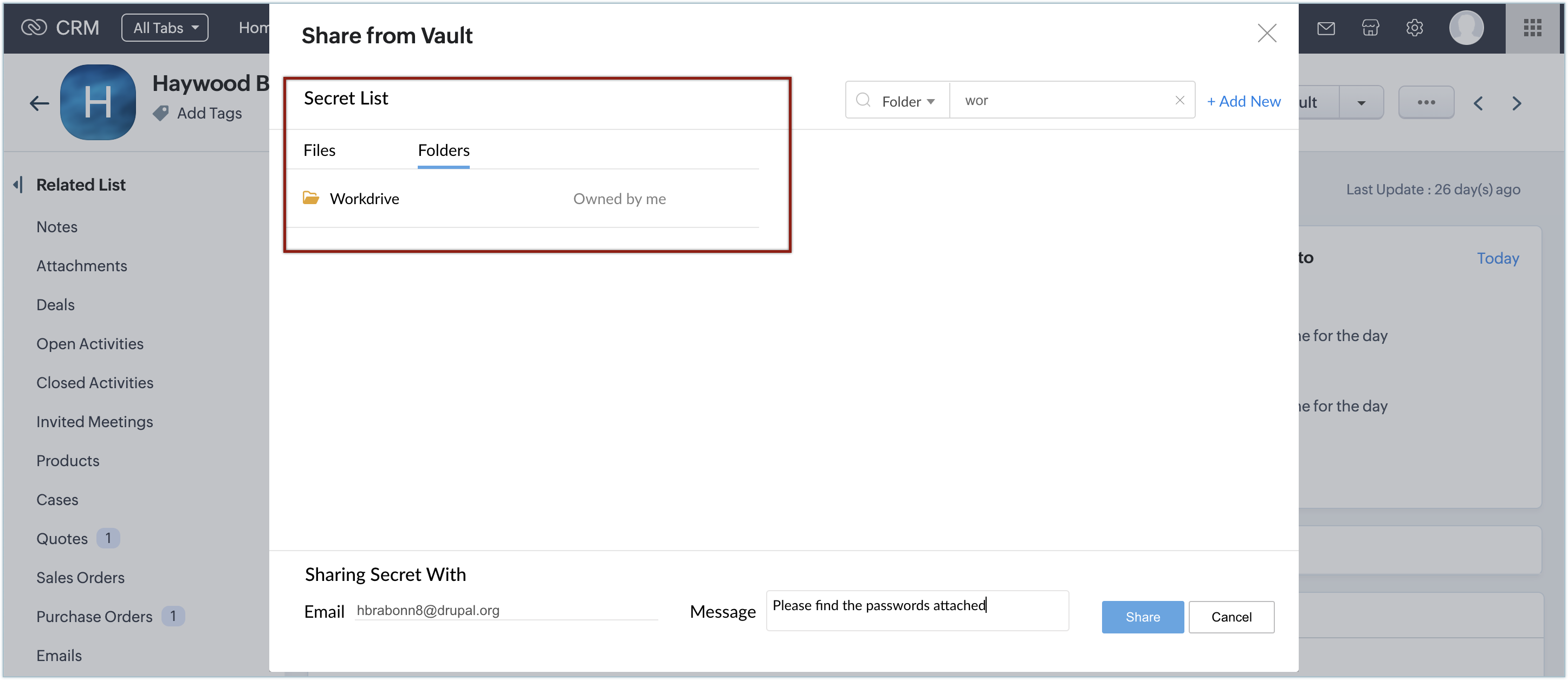 You can use your Zoho Vault passphrase to share your secrets with the records in your Leads and Contacts modules. Ensure that the record you choose have a valid email address. Otherwise, you will not be allowed to share secrets with them.
