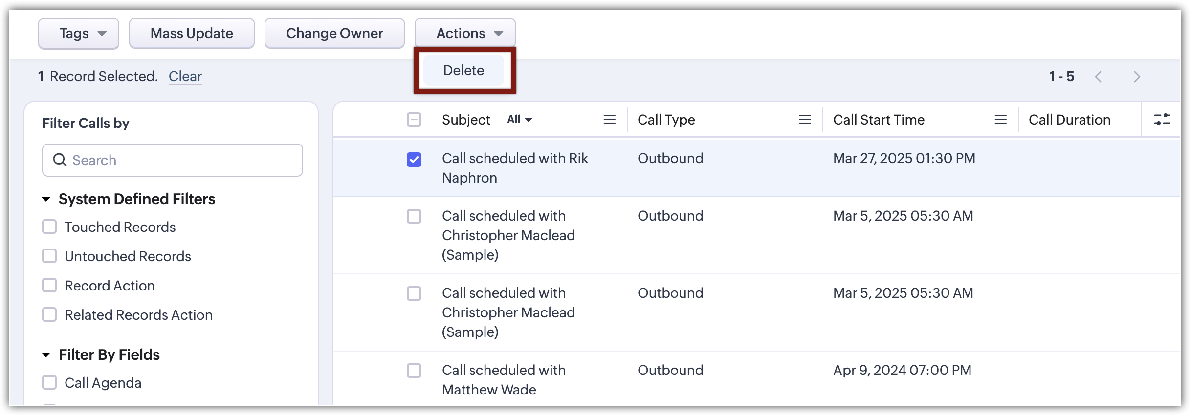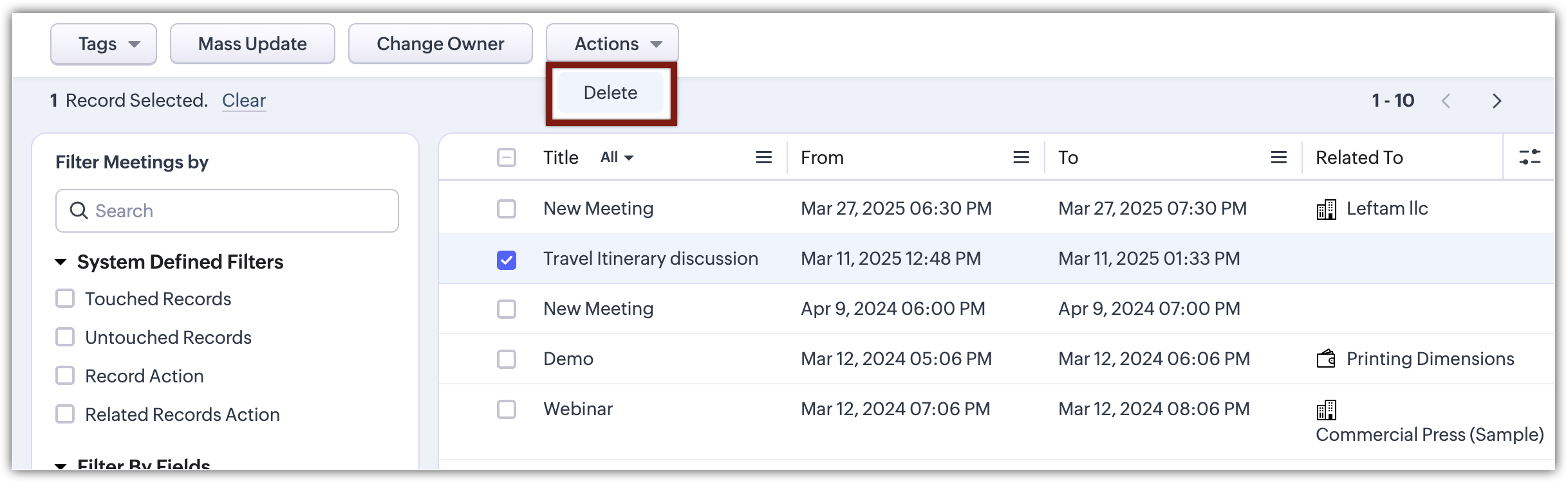 Go to the Meetings, Calls, or Tasks module.
