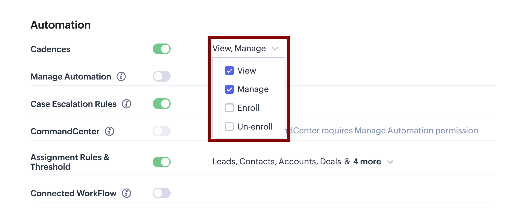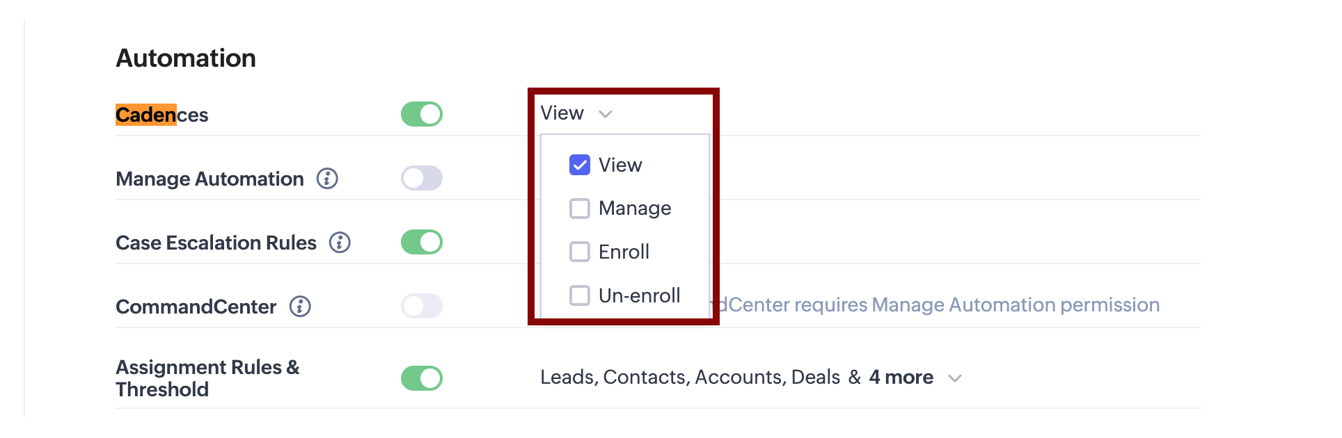 That said, users who already have Manage Automation permission will also be able to manage Cadences, since this permission automatically enables all Cadences permissions as part of broader automation access.