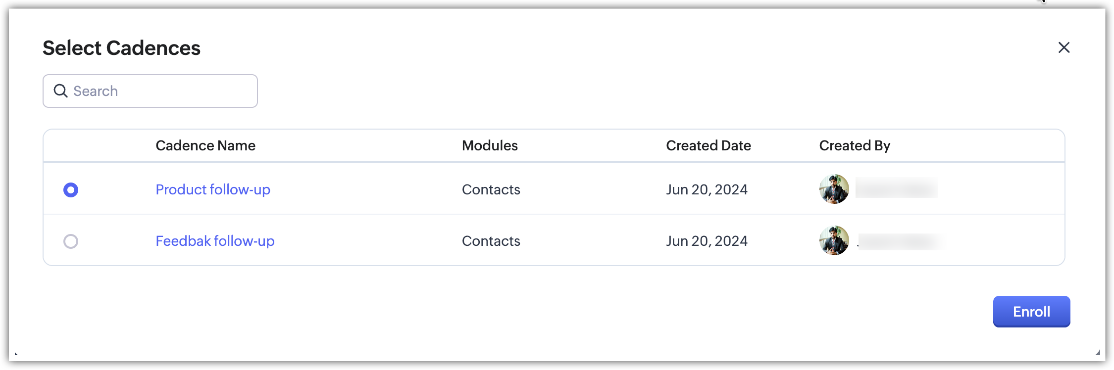 Cadences in Zoho CRM is module-specific. The user can choose the target audience for Cadences from:
