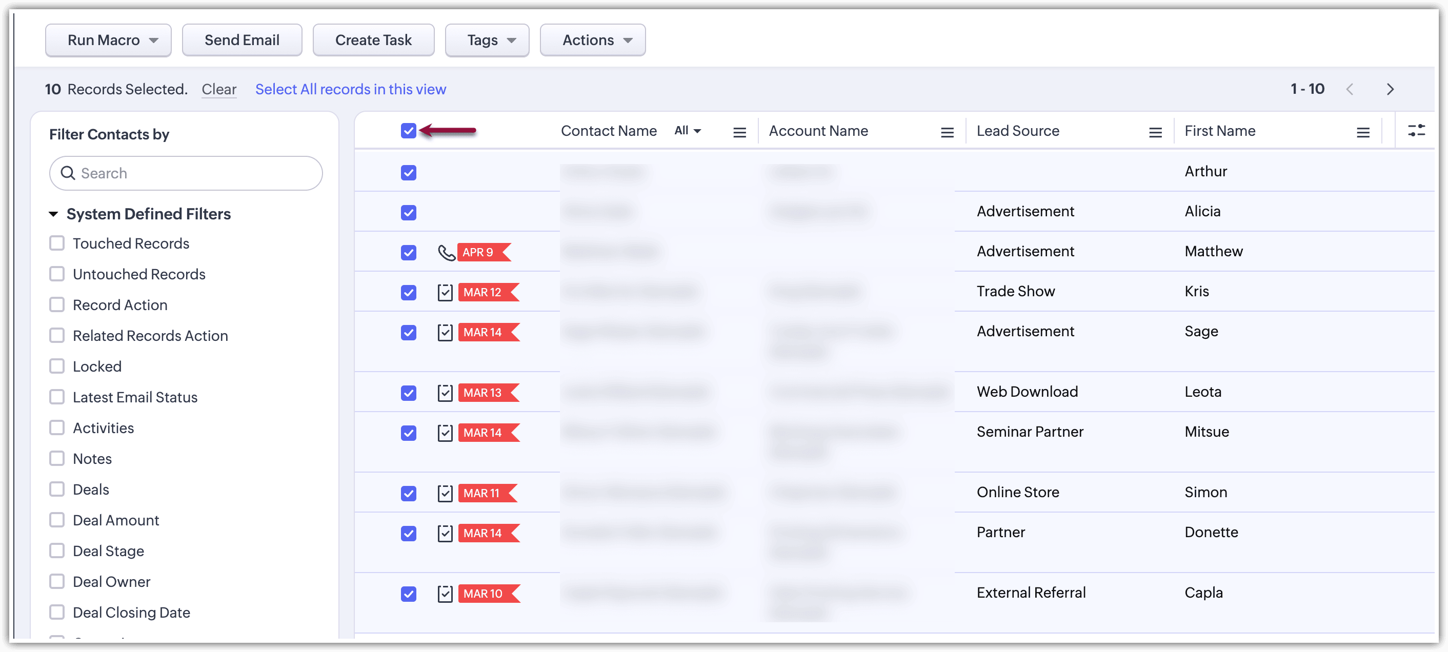 - Go to the records page in your module (Leads, Contacts or Deals).