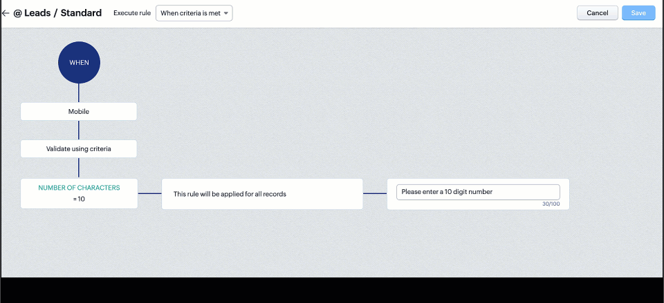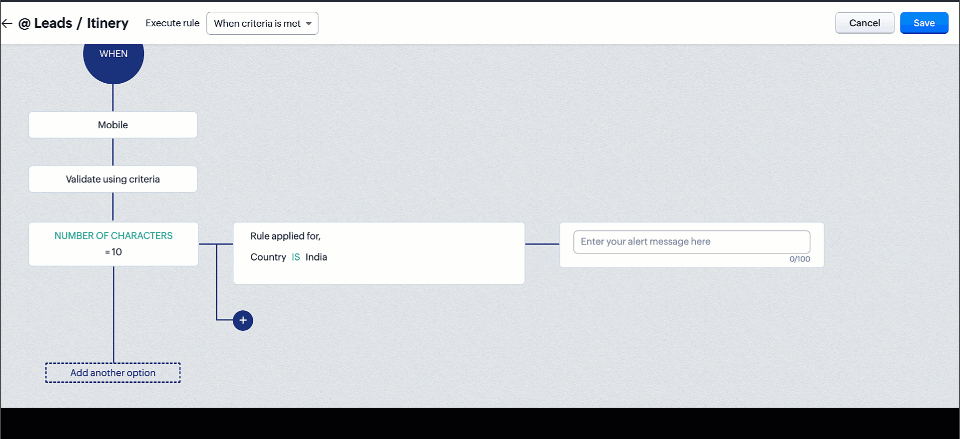 You can establish rules to validate the character count for mobile numbers. For example, you can stipulate that there must be exactly 10 digits for the system to accept and save a mobile number. Alternatively, when the country is specified as India, you can require that the number begins with "+91" to validate it accordingly. These rules enable precise validation of mobile numbers based on their respective criteria.