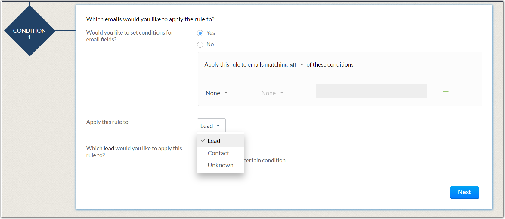 - Conditions Based on Modules: Module-based conditions involve selecting the context in which the rule is to be applied, offering options like Leads, Contacts, Unknown, or Custom modules. Selecting the 'unknown' module is crucial when the sender is new to your CRM account. However, it mandates setting conditions based on email fields. For example, rules could be established to trigger specific actions when an email from an unknown sender is directed to the CEO's email address, ensuring necessary follow-up or processing.