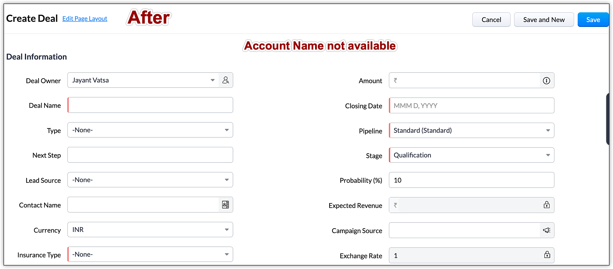 If your organization deals with other businesses and with individual customers (both B2B and B2C), disabling the Accounts module won't work. In this case, you need to make the Company and Account Name fields non-mandatory in both the Leads and Deals modules. This will allow you to save records without filling in those fields.
