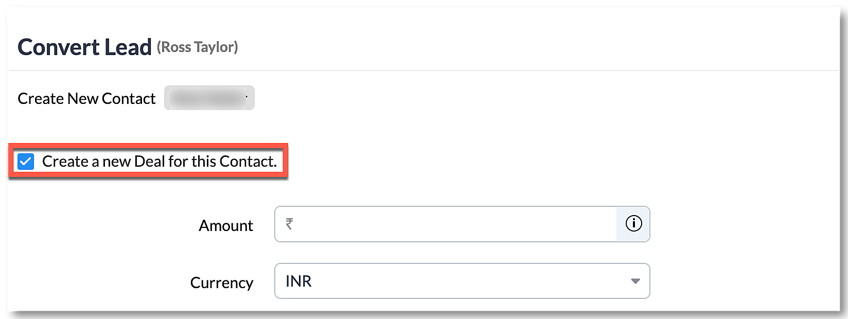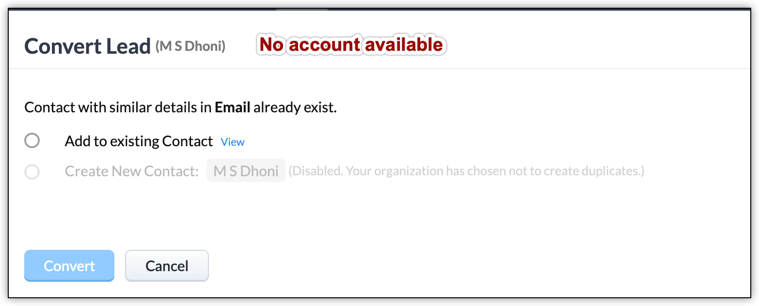 Don't fill in the Company name while adding a lead. When converting a lead to a contact, just check the Create a new Deal for this Contact box, fill in the details, and click Convert. You have now successfully associated a deal with a contact without creating an account.