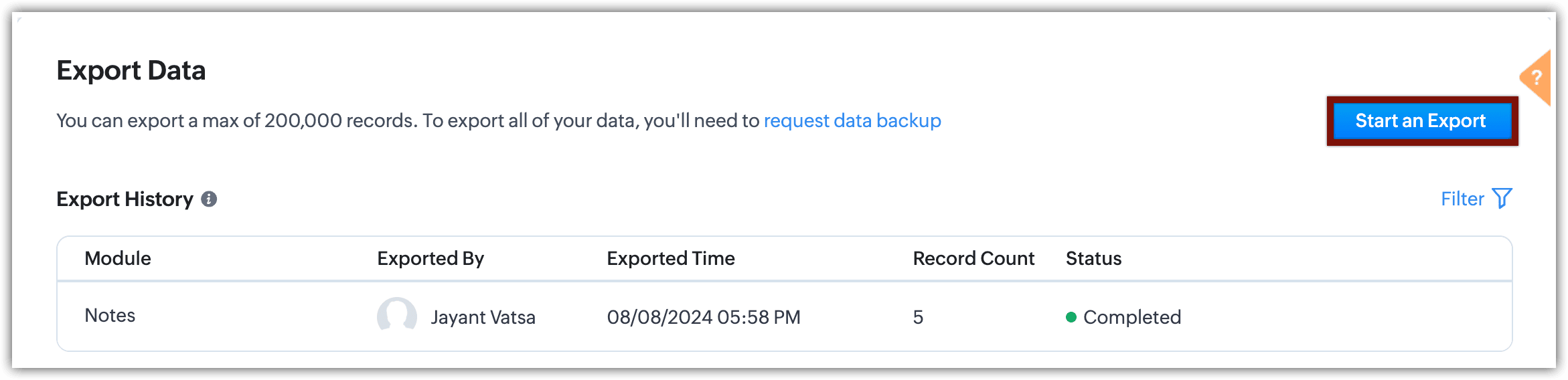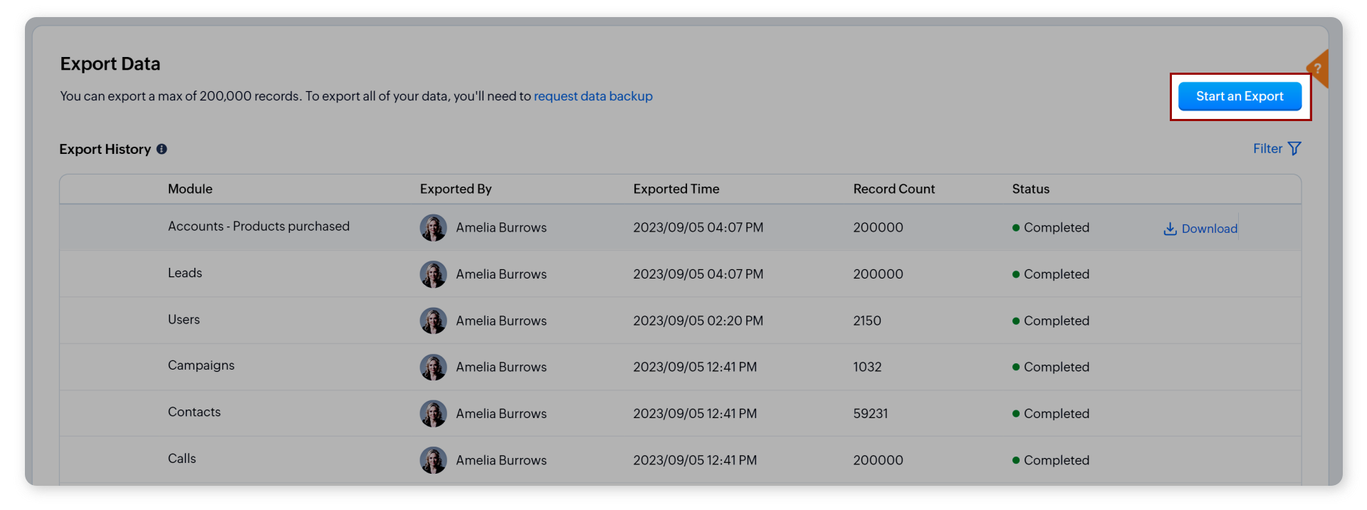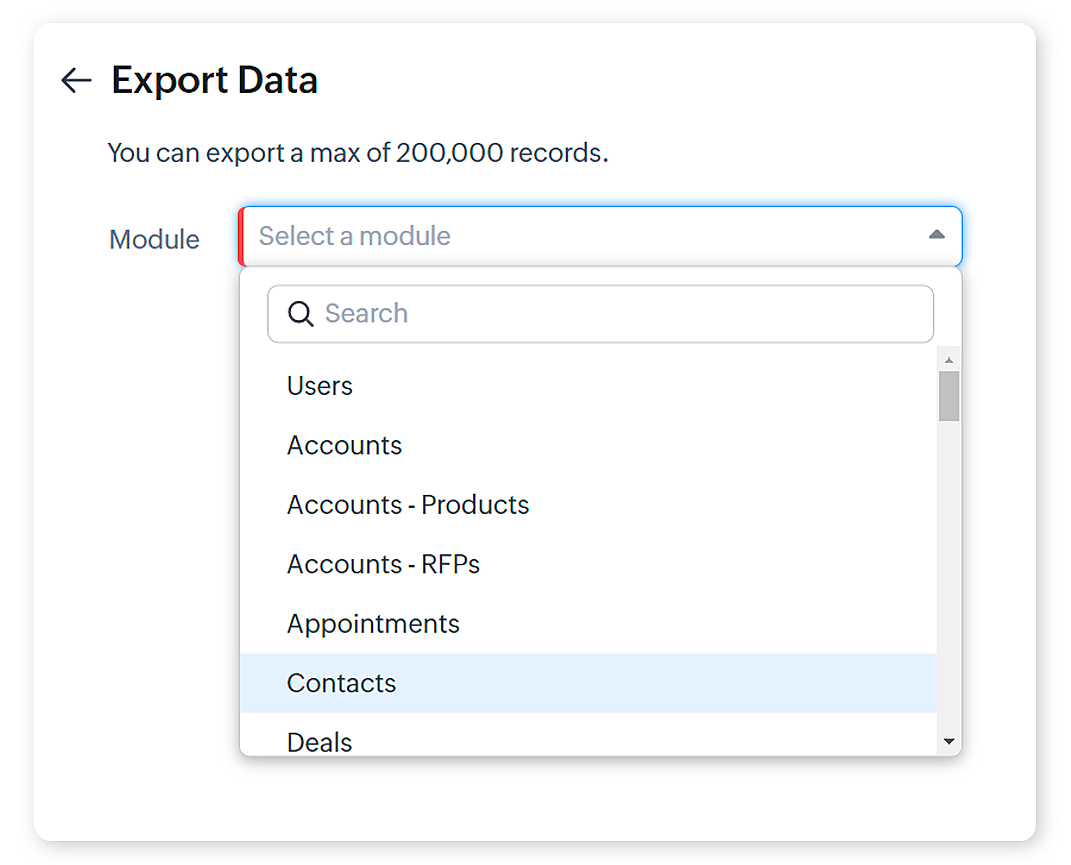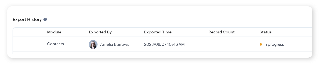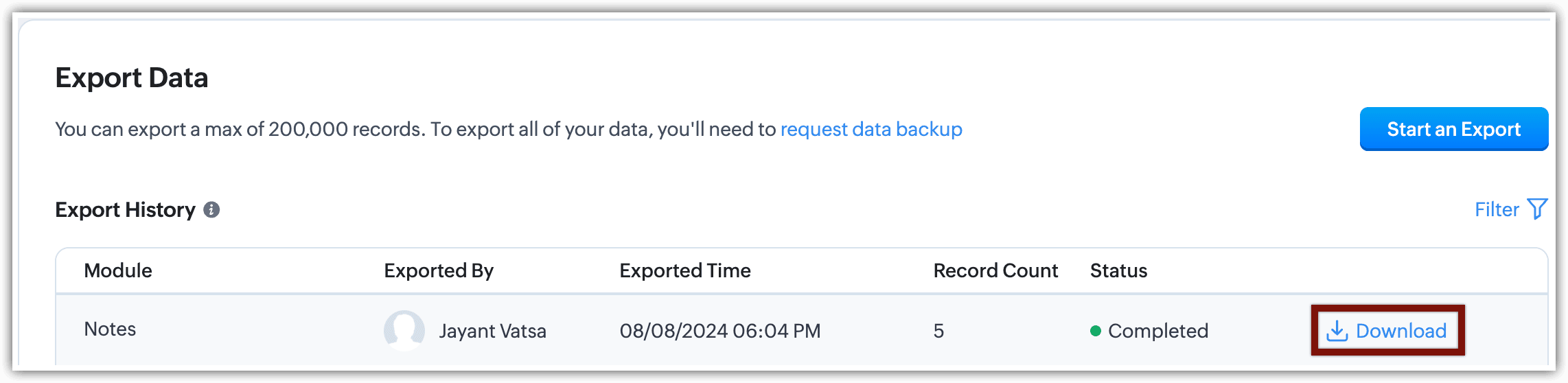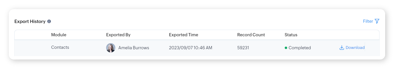 Note: You can export a maximum of 200,000 records from a single module in one go. These will be 200,000 of the oldest records that satisfy your export criteria and will be zipped in .CSV format. The download link for an export will be valid for seven days.