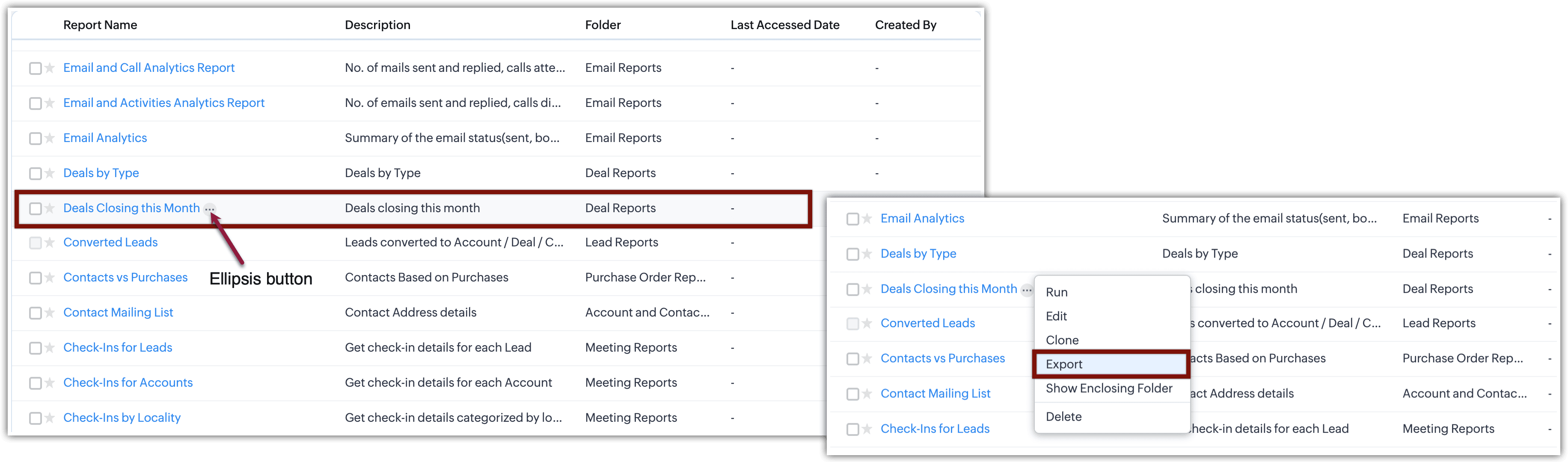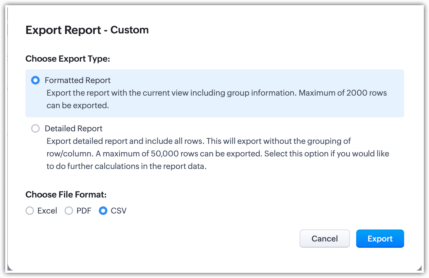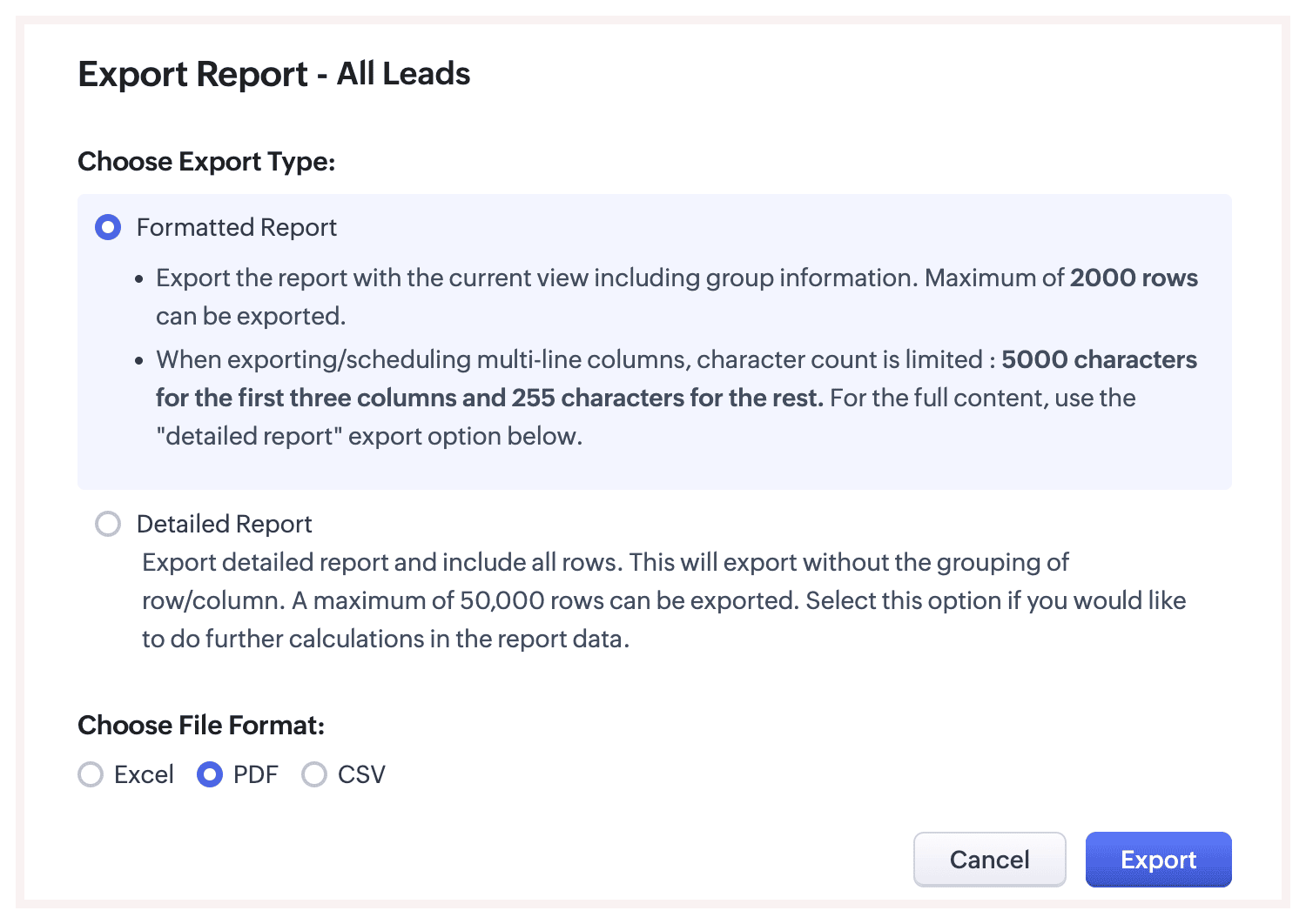 In Zoho CRM, you can export formatted reports in Excel, CSV, and PDF formats. For detailed reports exports, only Excel and CSV formats are available. Each export format has specific restrictions regarding the volume of data that can be exported.