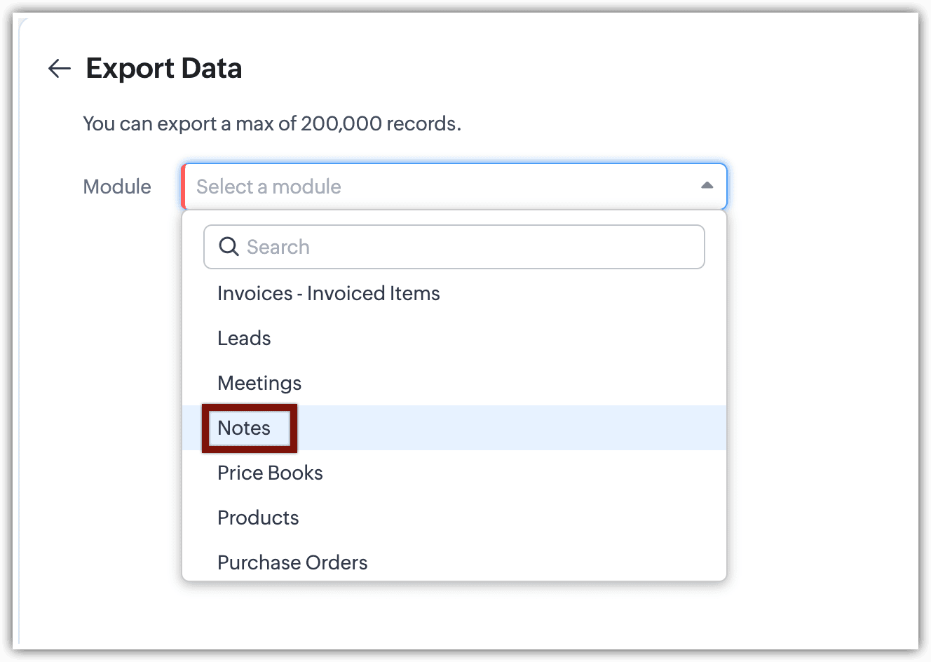 The Export Notes feature enables you to export notes from Zoho CRM records in CSV format. You can export a maximum of 3,000 notes at a time.