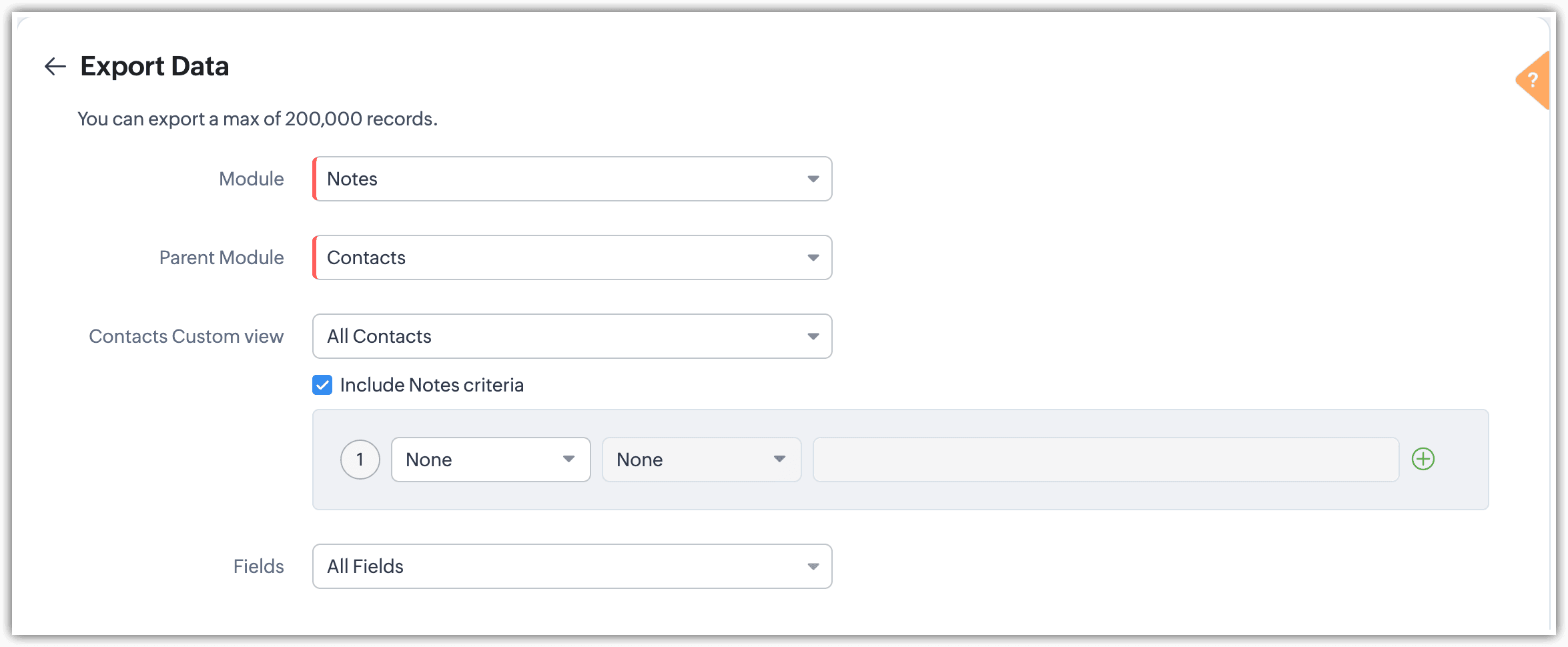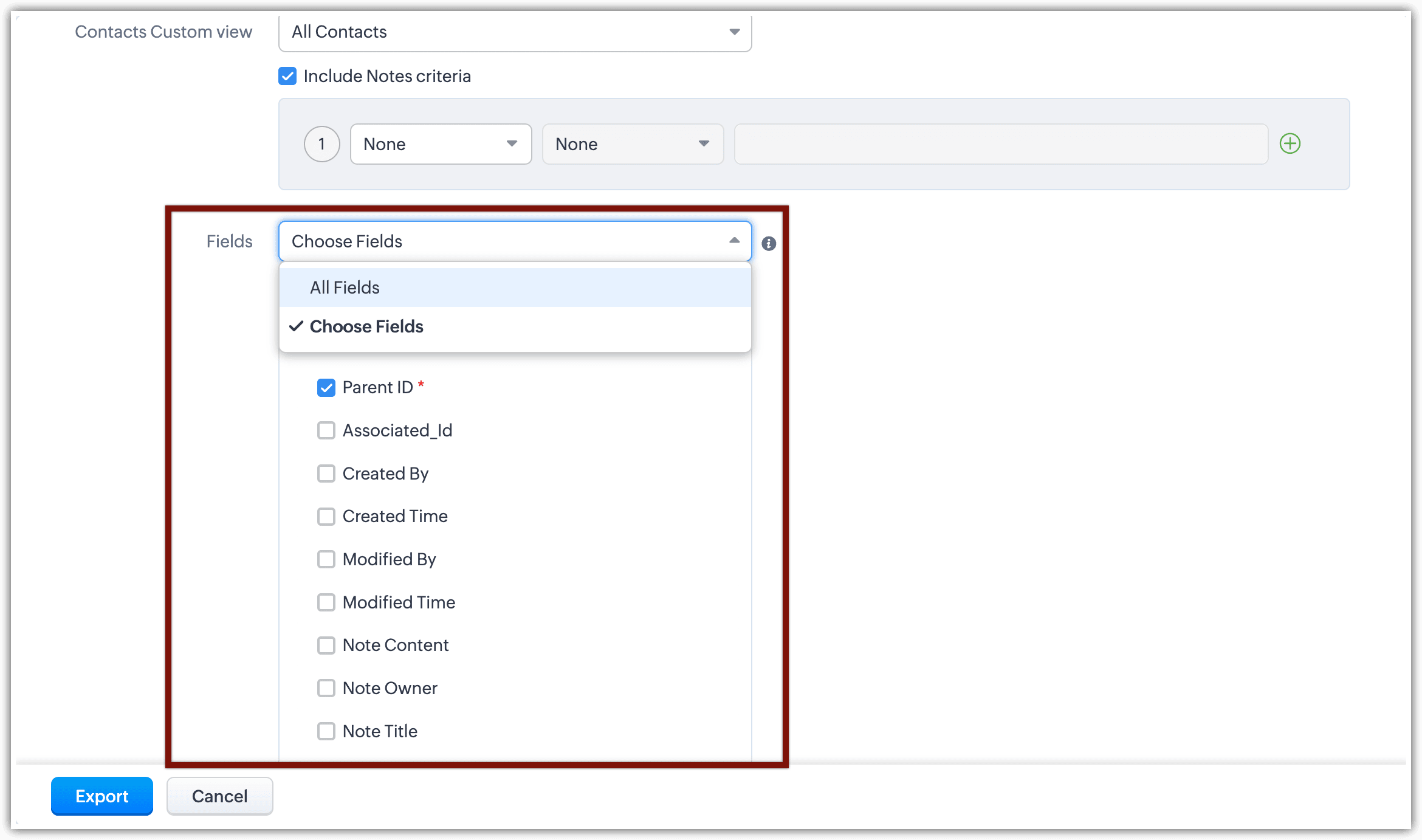 - Next, you can select from custom views of the parent module, such as All Contacts or My Contacts (if the Contacts module is the parent module). Additionally, you can filter notes based on specific criteria by enabling the Include Notes Criteria option.