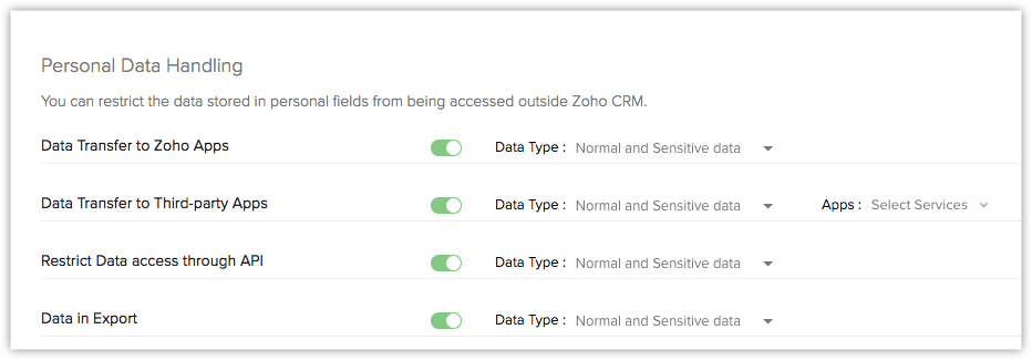 The data controller has the option to mark the user's fields as personal and sensitive in Zoho CRM. The controller can also decide to restrict these fields from activities like exports, APIs, and other connected services of Zoho CRM (Books, Finance, Campaigns etc).