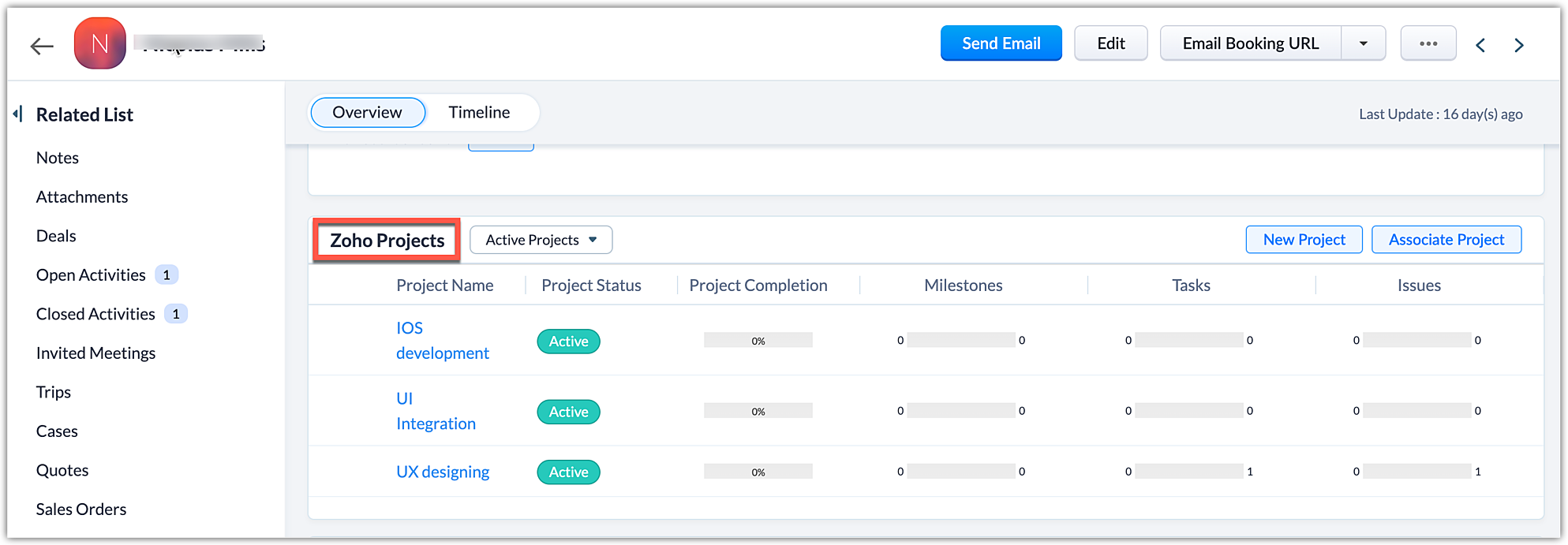 In Zoho CRM, clients can be directly associated with projects, offering them transparency and visibility into their progress. You can also associate ongoing projects to the Accounts, Contacts, or Deals modules in CRM.
