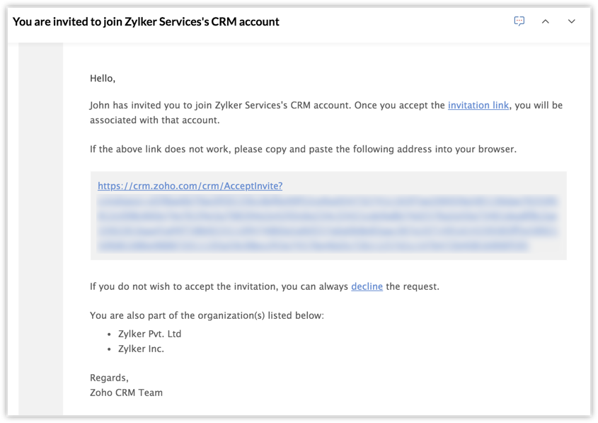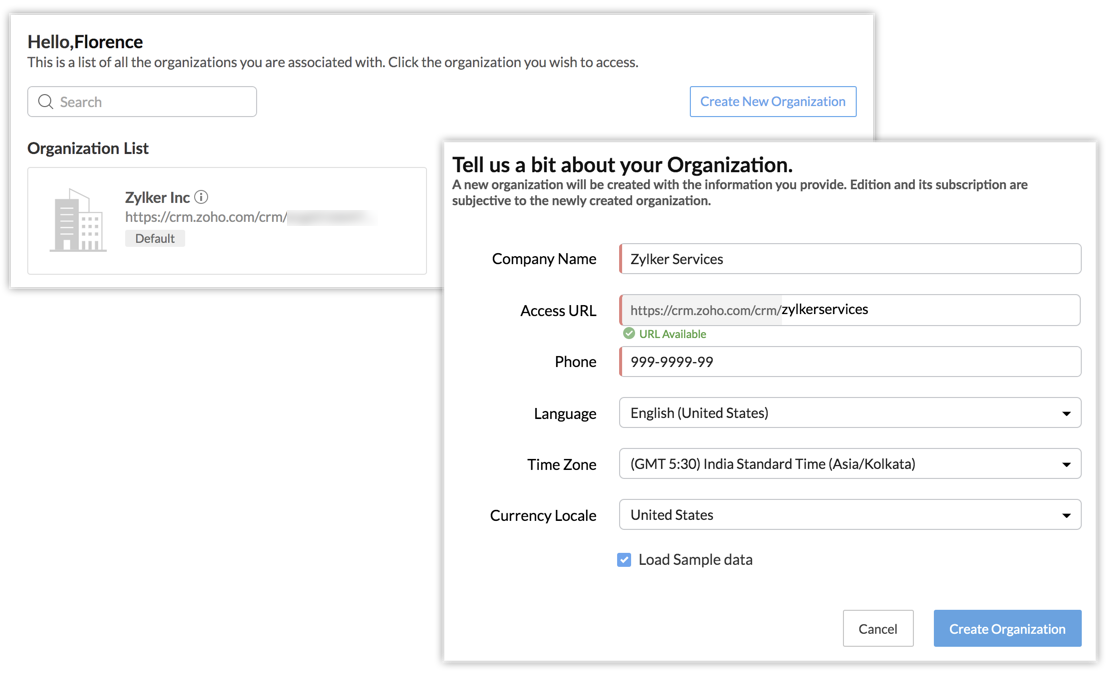 Zoho CRM allows users to access multiple organizational (CRM) accounts using the same email address. This is especially useful for organizations that maintain different CRM accounts to manage their business, such as a franchisee or a subsidiary.