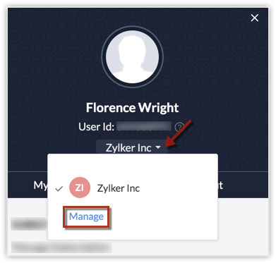 - In the profile pop-up, click the arrow next to the company name and click Manage.