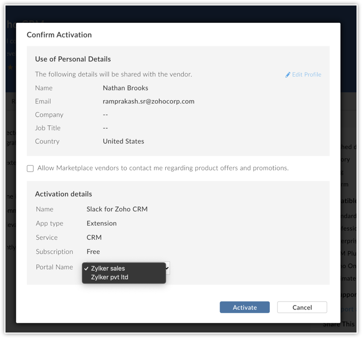 b) If the integration was enabled from Zoho CRM Marketplace.