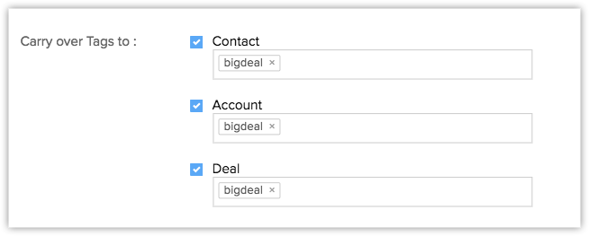 In CRM, you can convert leads to contacts, deals, and accounts and quotes to orders and invoices. If you have added tags to the records in these modules, you can choose to carry over these existing tags to the new modules.