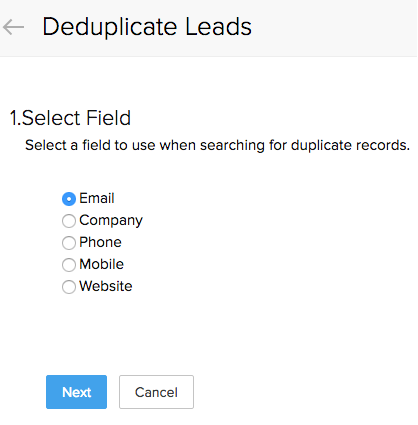 3. In the Deduplicate [Module] page, select a field through which you would like to search for duplicate records.