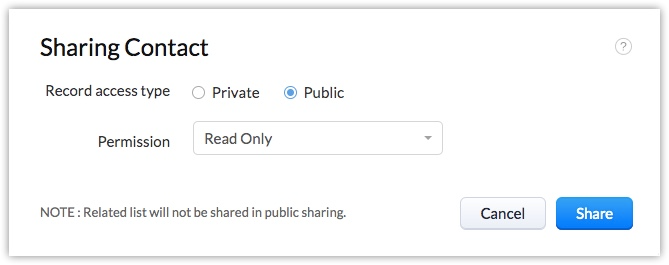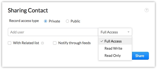 There are three types of permissions that can be given to the users while sharing a record, depending on the action you want them to perform on the record.