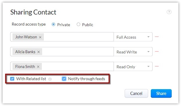 Select the Notify through feeds checkbox to alert users when you share records with them.