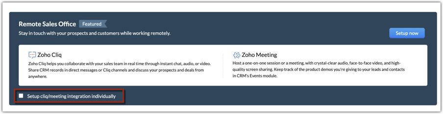 - Click Setup Now for Zoho Cliq and/or Zoho Meeting.