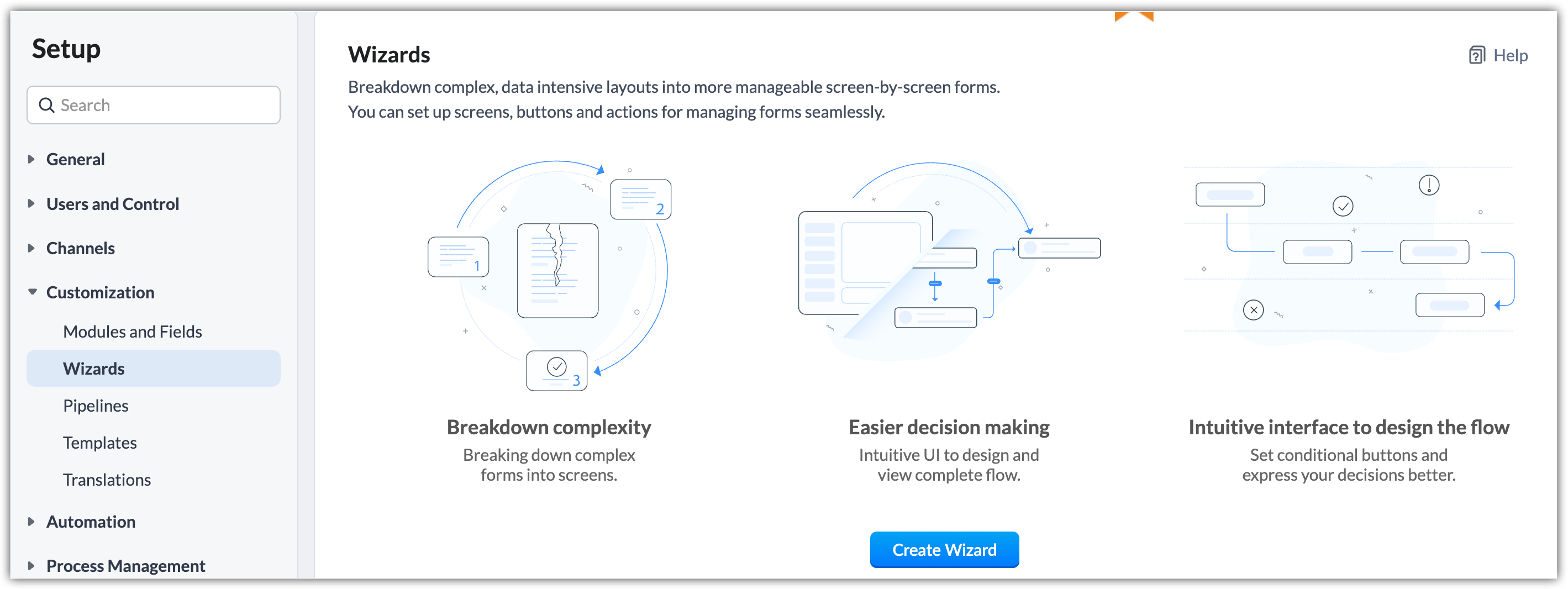 A Wizard helps you divide a long form into a series of screens, where users can enter data on each screen as they proceed to the next step until completion. A step-wise approach is less overwhelming and reduces chances of erroneous data entry, as the partially completed form can be saved as draft and submitted later.