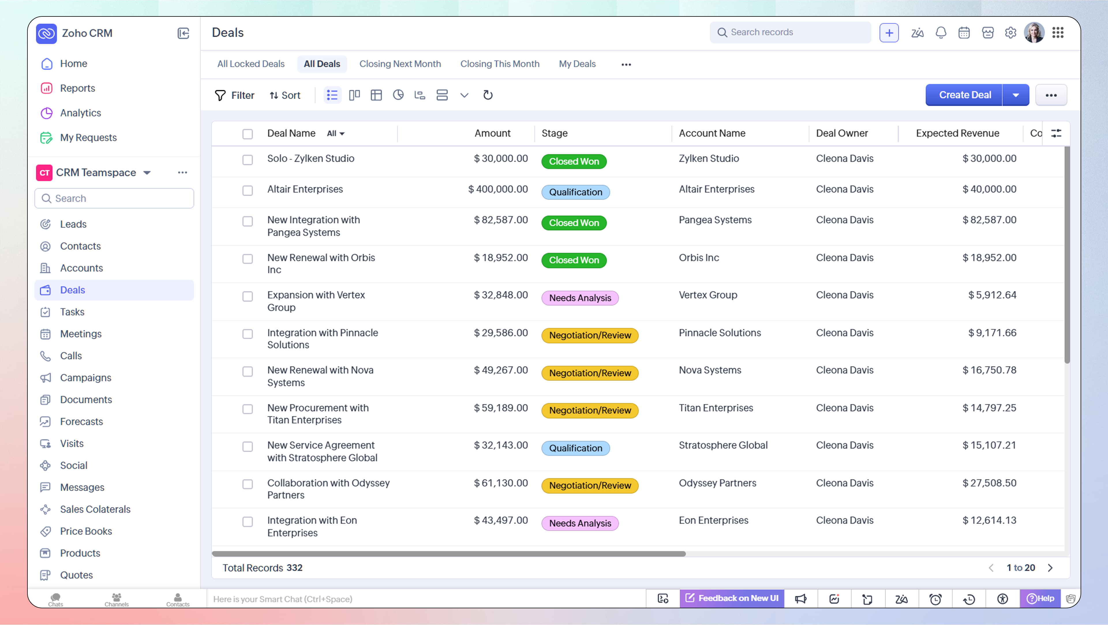 - Create records manually, import data into the Deals module, or migrate your existing CRM data.