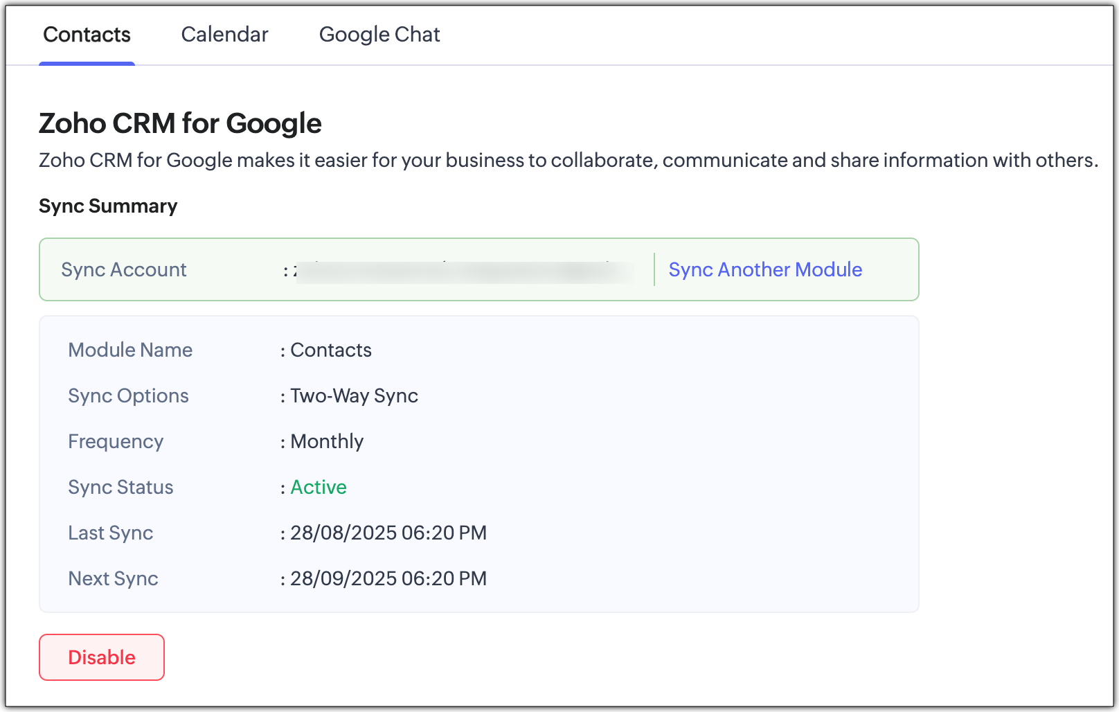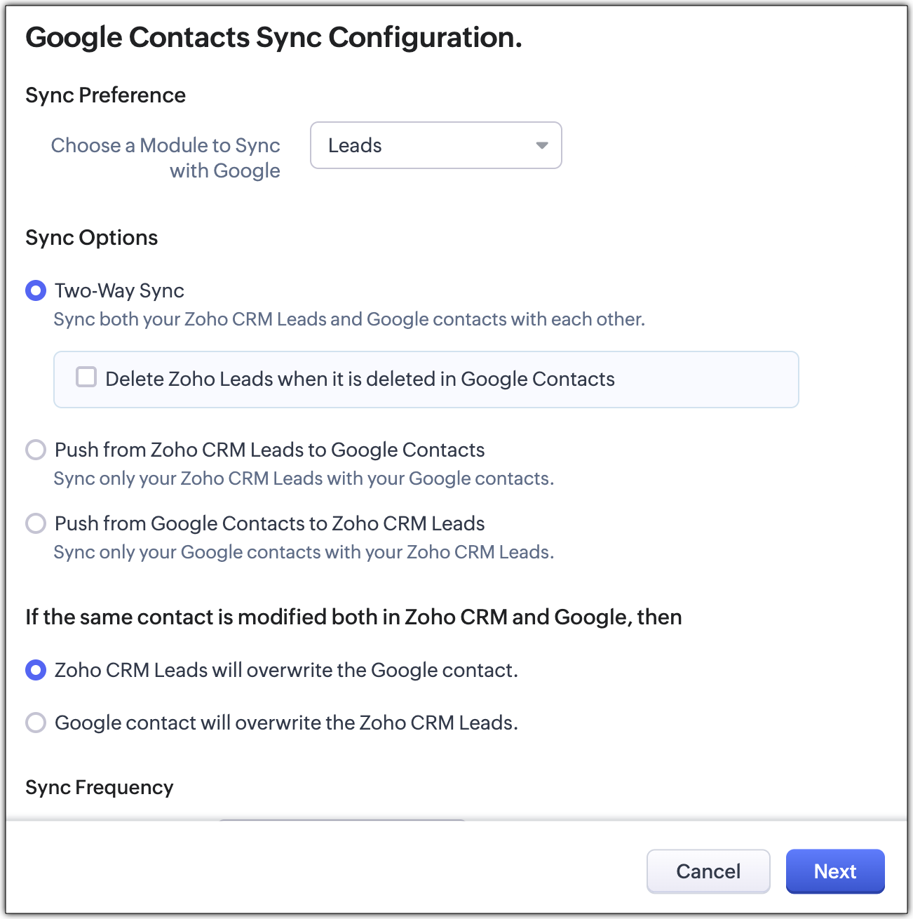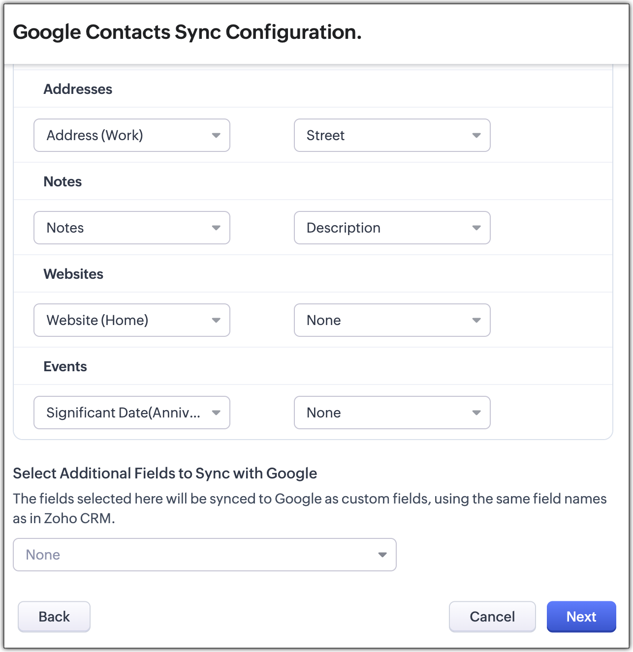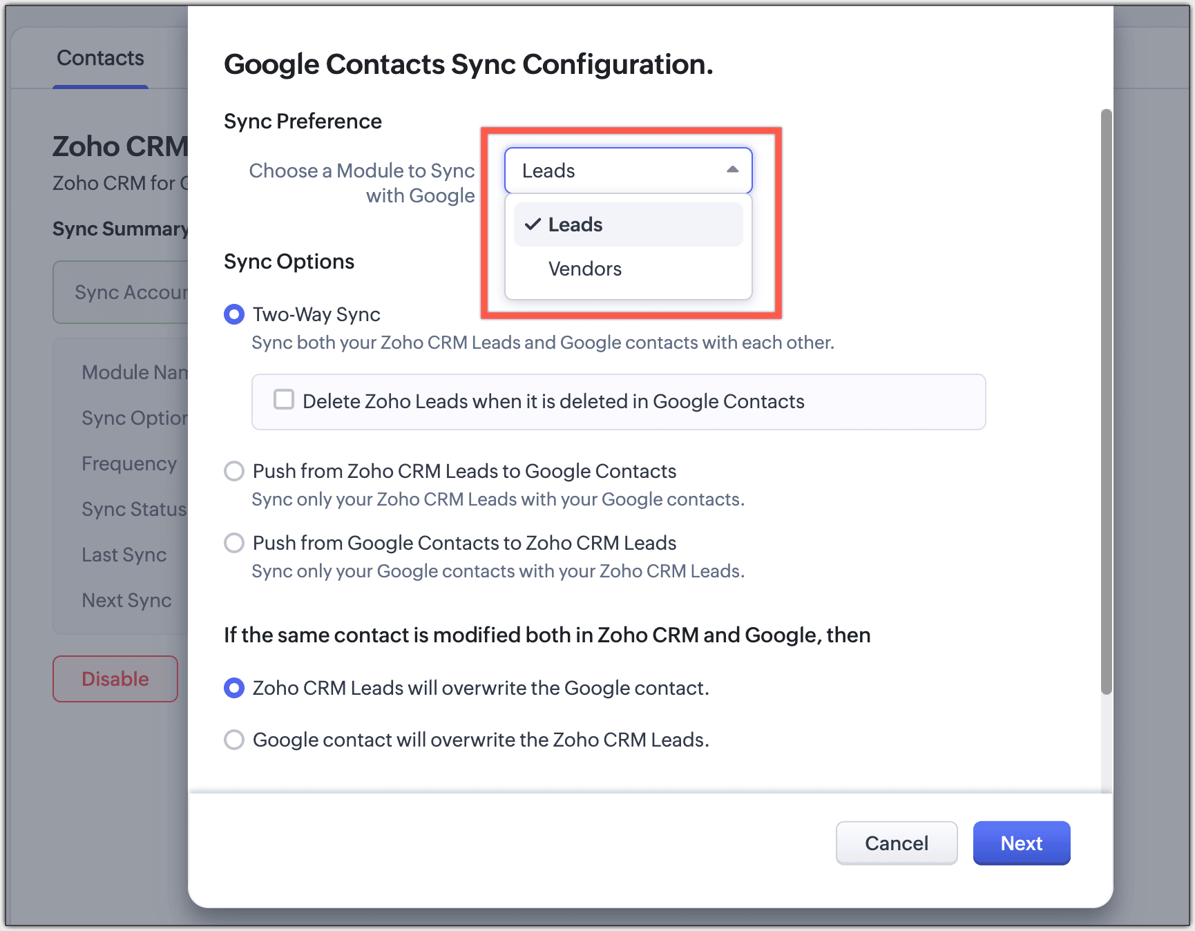 Keeping up-to-date contacts in both Zoho CRM and Google Contacts is now made easy with the Contacts Synchronization feature. It helps you to configure one-way or two-way sync schedules that will automatically sync contact details. Also, you can specify the list to which the contacts should be transferred and map fields as required.