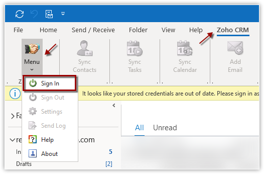- In Microsoft Outlook, go to the Zoho CRM tab and click Menu > Sign In.