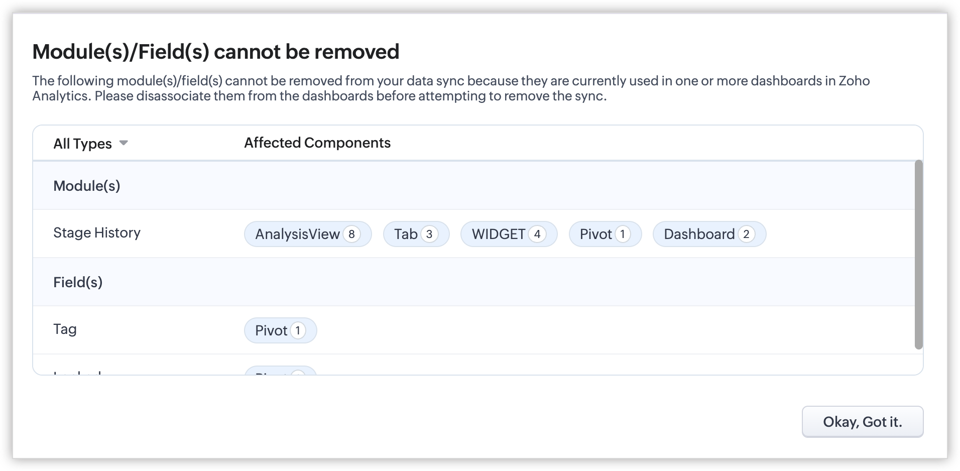 - Inside the CRM, if you try removing the sync of modules or fields from Advanced Analytics that are associated with any of the created components, an alert pop-up will ask you to disassociate them in the Analytics first and then proceed with removing the sync of modules or fields in the CRM