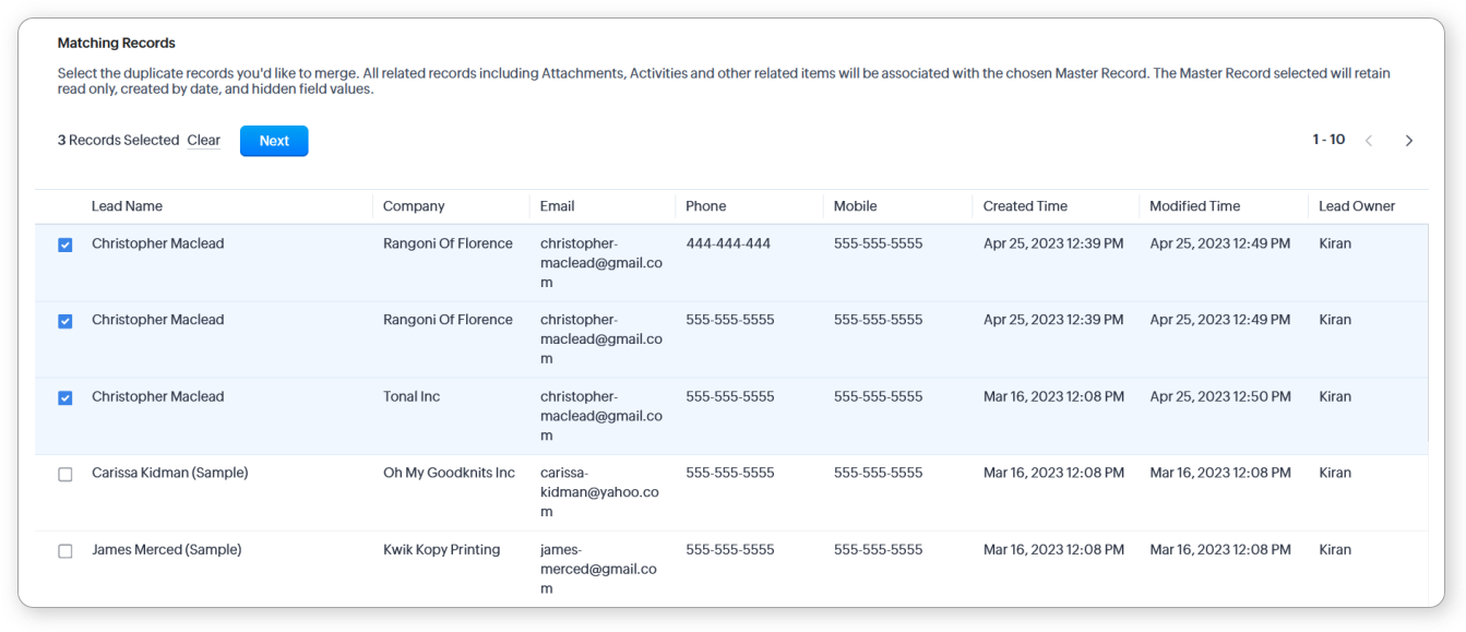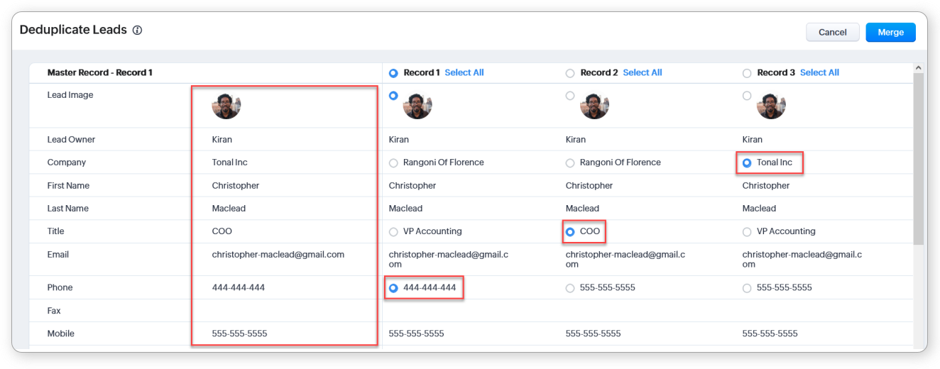 This tool is available only in the Leads, Accounts, Contacts, Deals, Vendors, and custom modules and you can merge maximum three records at a time.